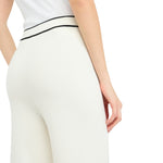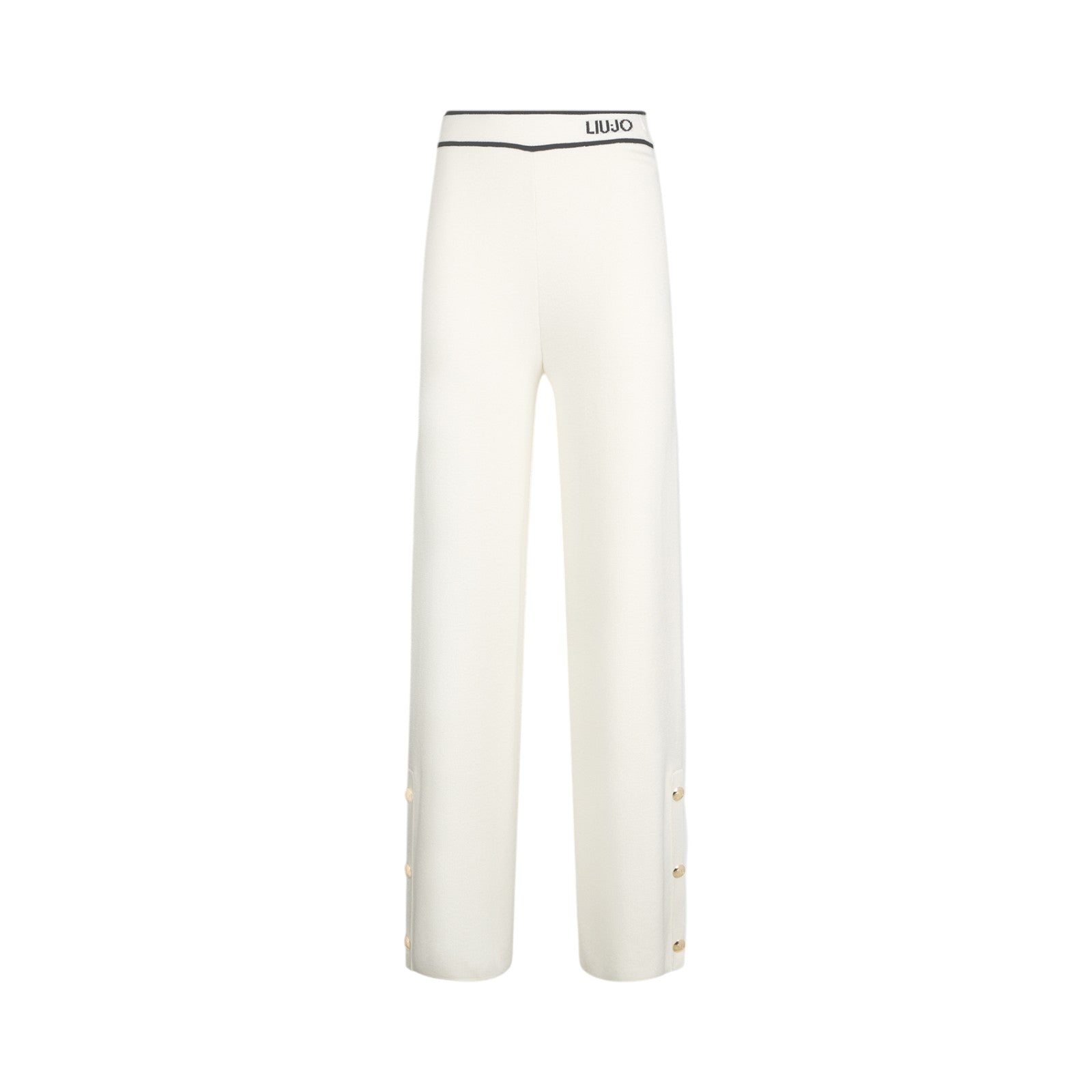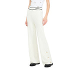 Pantaloni in maglia di misto seta. Dettagli a contrasto con logo jacquard. Cintone elastico in vita. Bottoni laterali al fondo. La modella è alta 180 cm e indossa la taglia S.