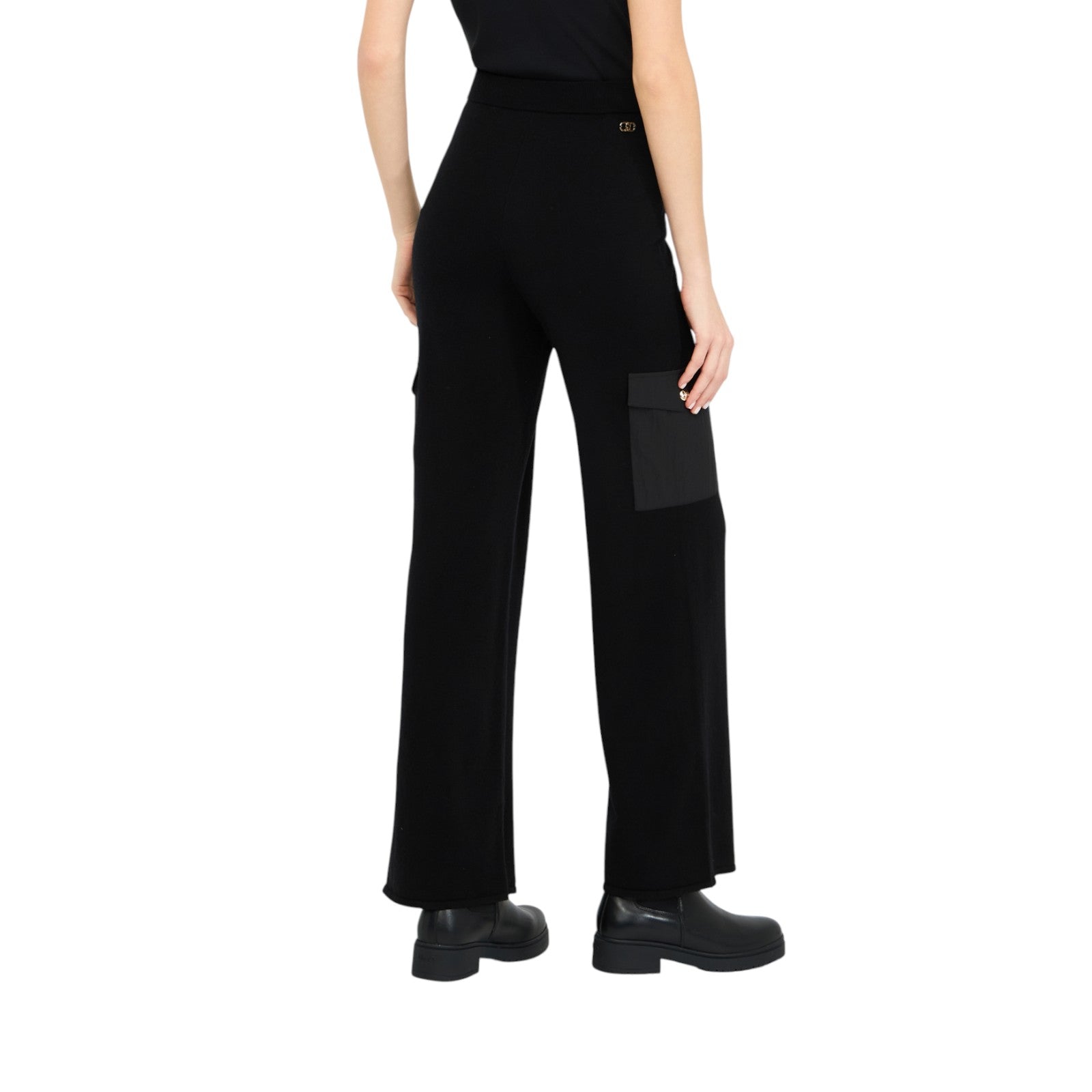 Pantaloni jogging neri. Realizzati in maglia di misto viscosa. Cintone elastico con coulisse in vita. Tasche cargo in nylon. Logo LJ in metallo sul retro. La modella è alta 180 cm e indossa la taglia S.