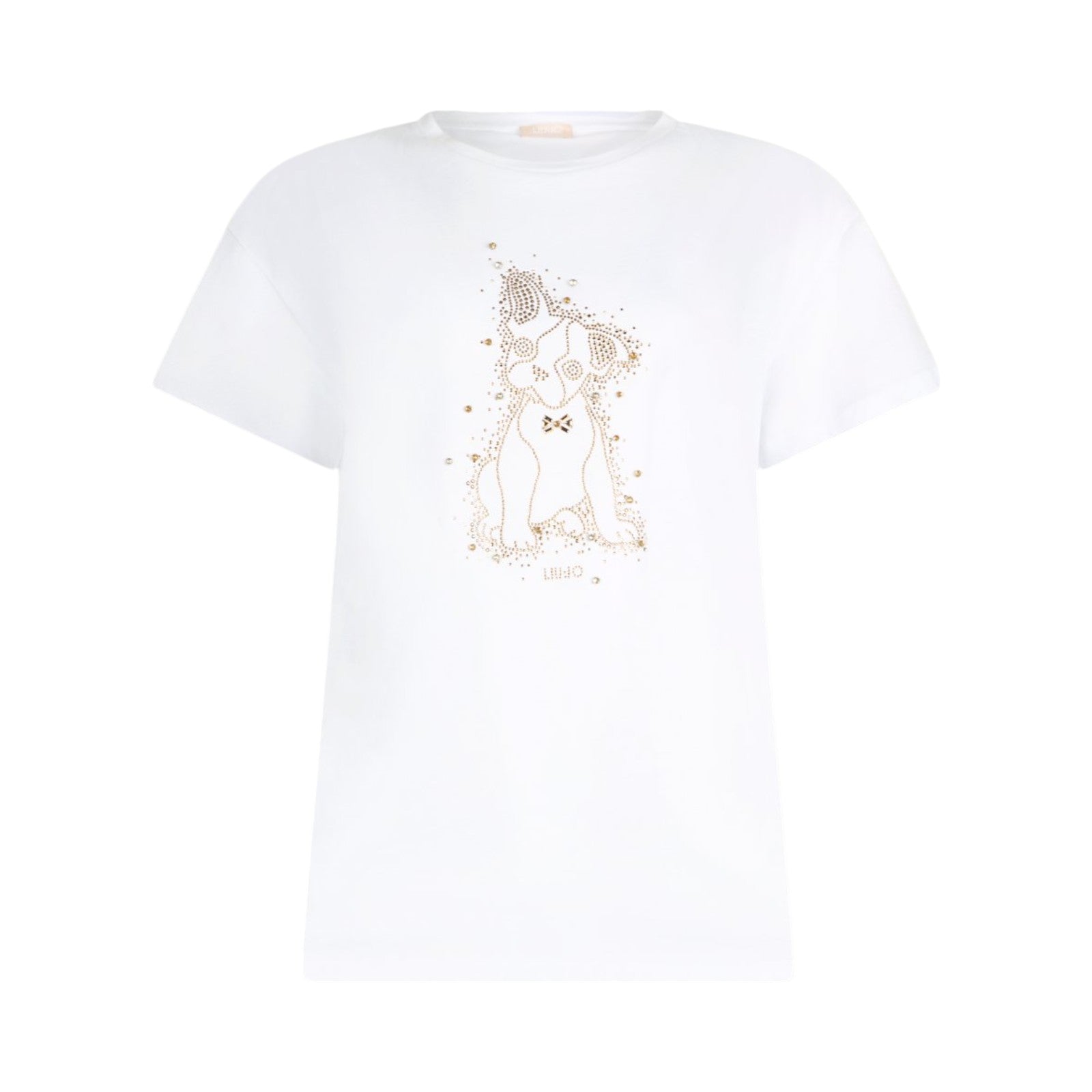 T-shirt 100% cotone. Maniche corte. Girocollo. Strass applicati sul davanti. Prodotto "Liu Jo Better".