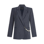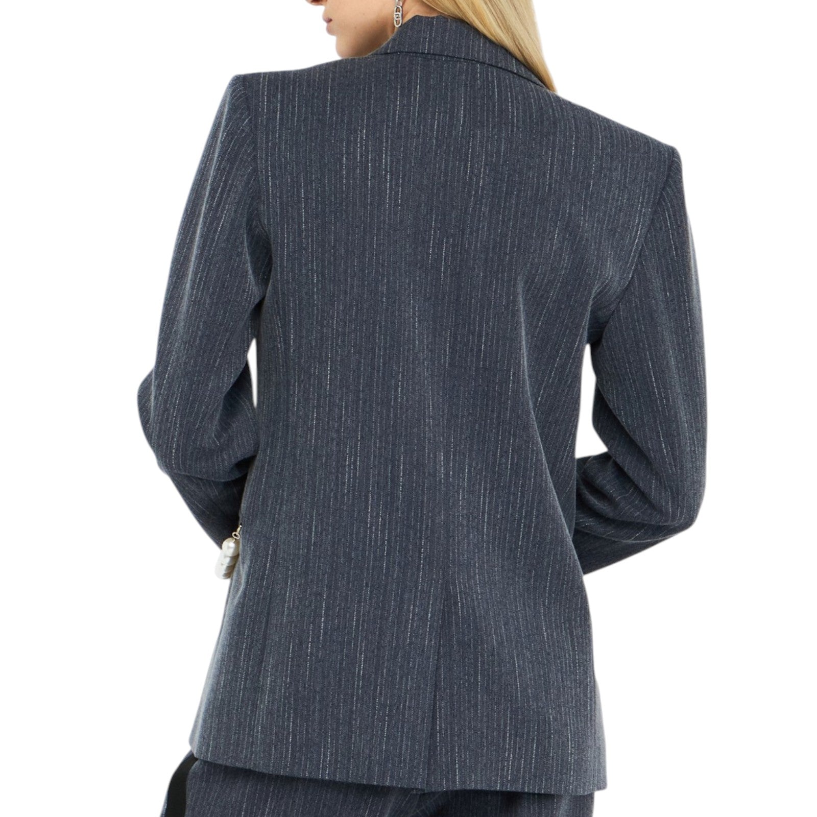 Blazer in flanella di misto viscosa stretch. Motivo gessato. Catena con perle e moschettone. Vestibilità over. Revers classico. Tasche a filetto. Spacco sul retro. Chiusura doppiopetto con bottone. La modella è alta 180 cm e indossa la taglia 40.