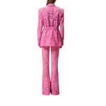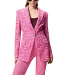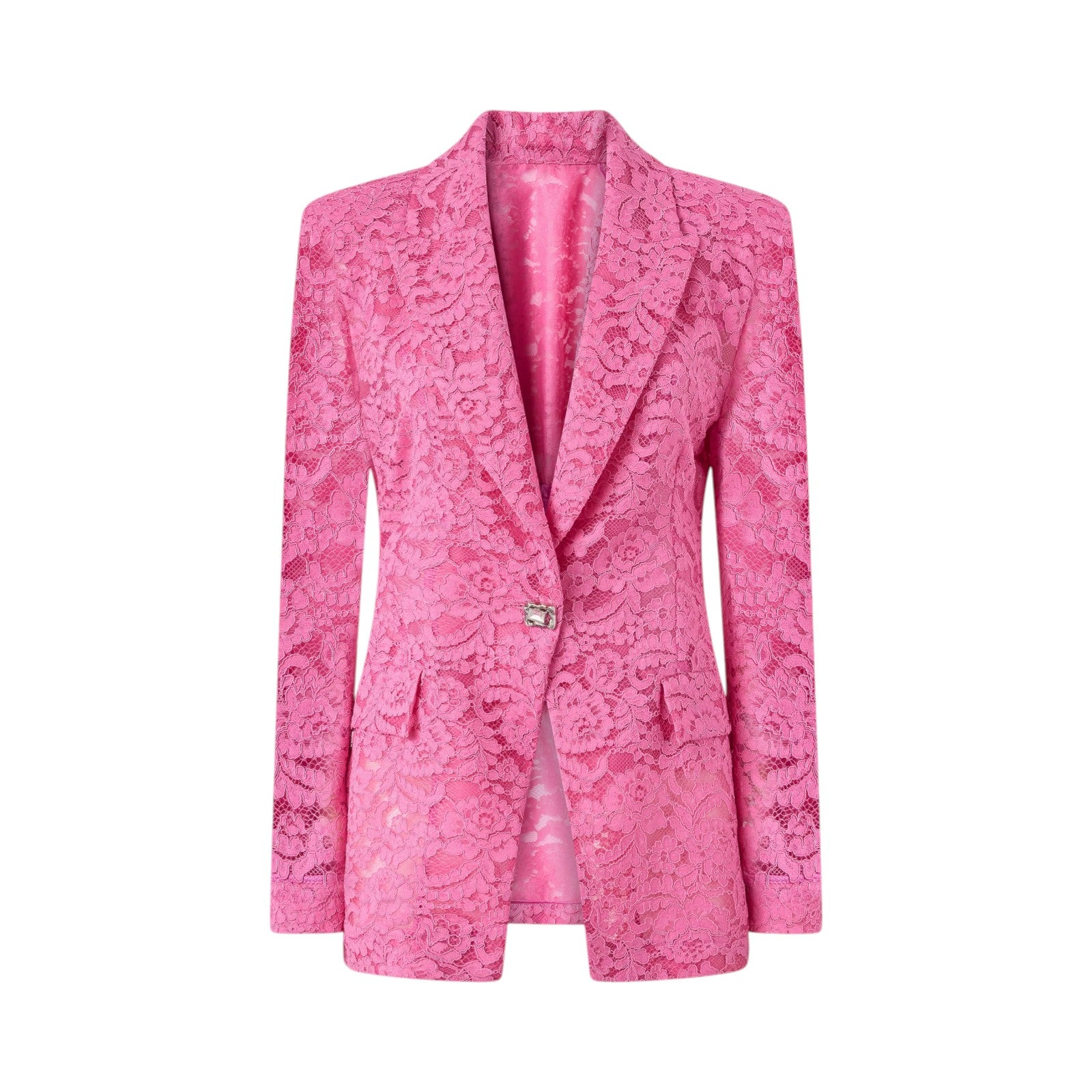 Giacca con fodera interna dotata di revers a lancia, vita elasticizzata sul retro e tasche frontali con patta e impreziosita da un bottone gioiello sui polsi e sulla chiusura monopetto. La protagonista indiscussa del modello è però la lavorazione: un sofisticato pizzo rebrodé con ricchi motivi floreali ricamati in modo tale da risultare tridimensionali, per un effetto finale scenografico e seducente.