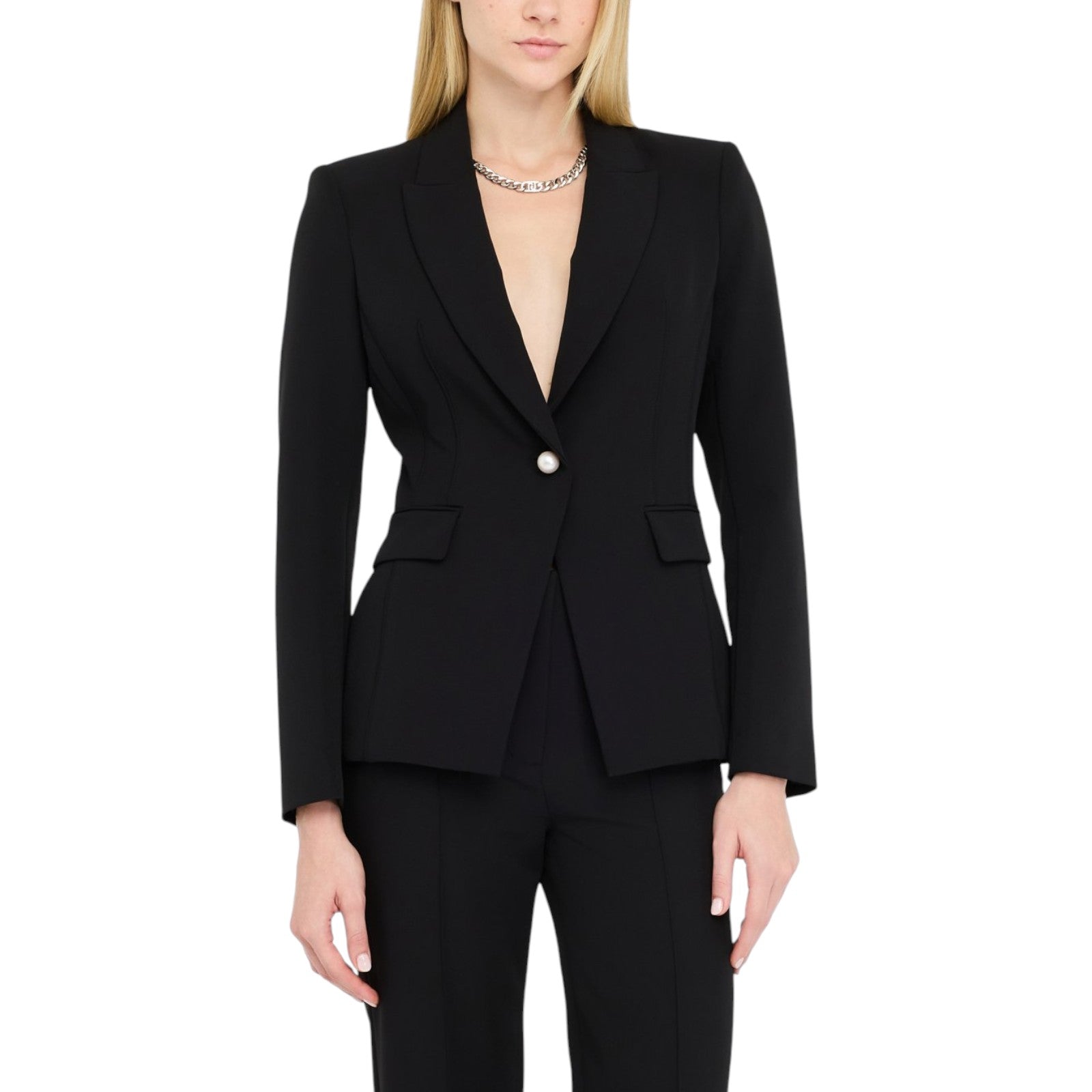 Giacca elegante nera in tessuto tecnico stretch. Taglio slim fit. Revers classico. Tasche con patta. Spacchetto sul dietro. Chiusura con bottone-perla. Prodotto "Liu Jo Better".