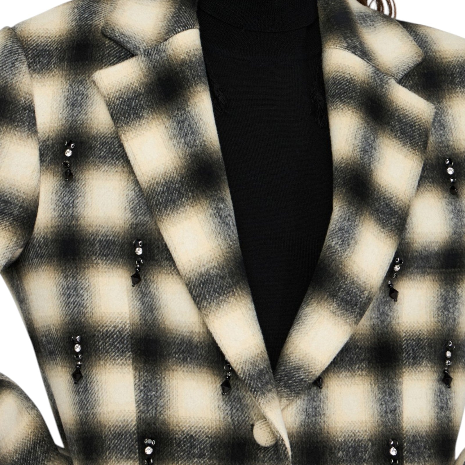 Giacca elegante in misto lana. Fantasia a quadri. Rever classico. Tasche a filetto. Polsi con bottoni rivestiti. Ricami gioiello sul davanti. Chiusura monopetto.