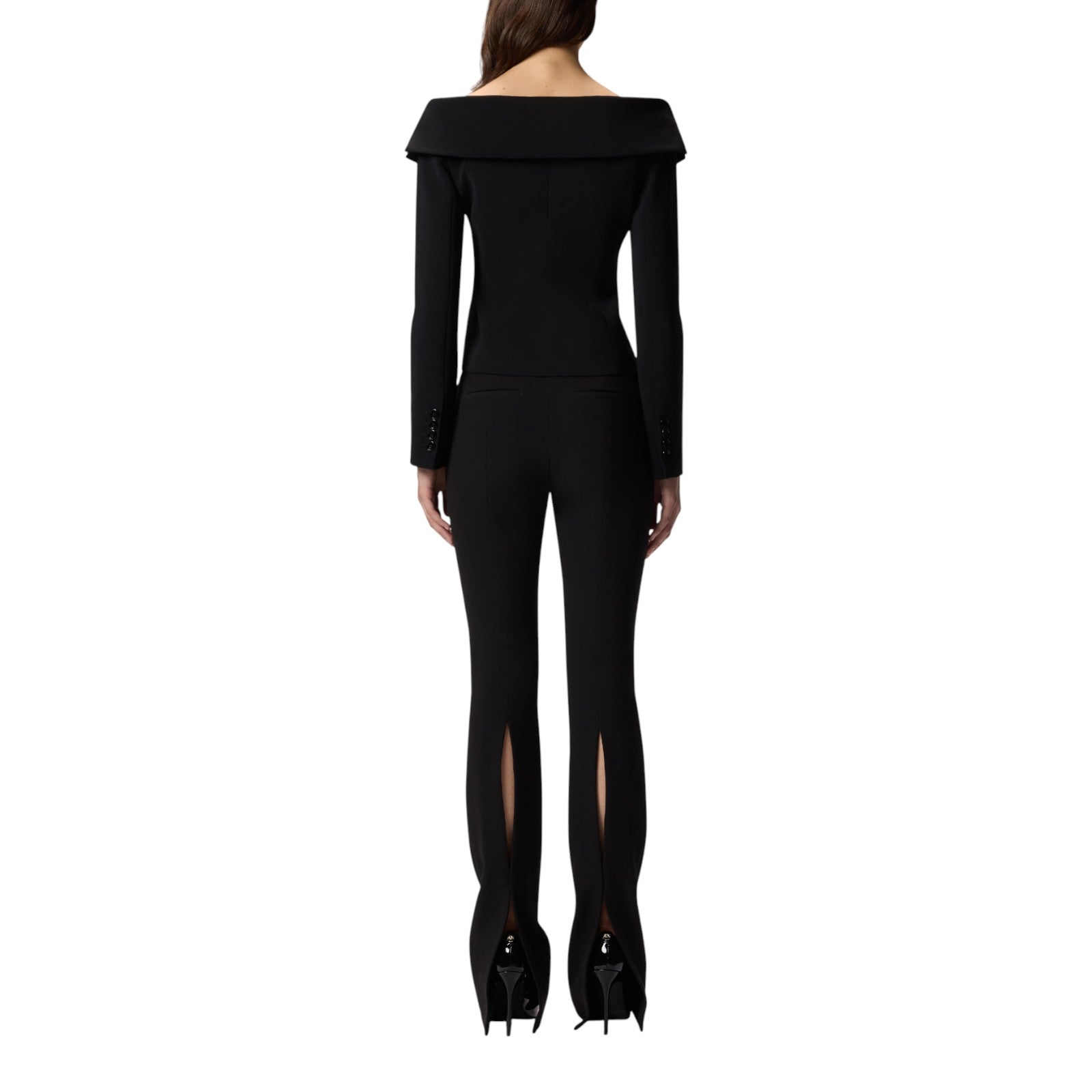 Giacca aderente a maniche lunghe realizzata in tessuto crêpe stretch che sottolinea la figura. L'abbottonatura decentrata, i polsini con bottoni e le tasche laterali a filetto sono un chiaro rimando al design di un classico blazer, mentre lo scollo ampio che lascia le spalle scoperte rende il modello decisamente femminile.