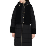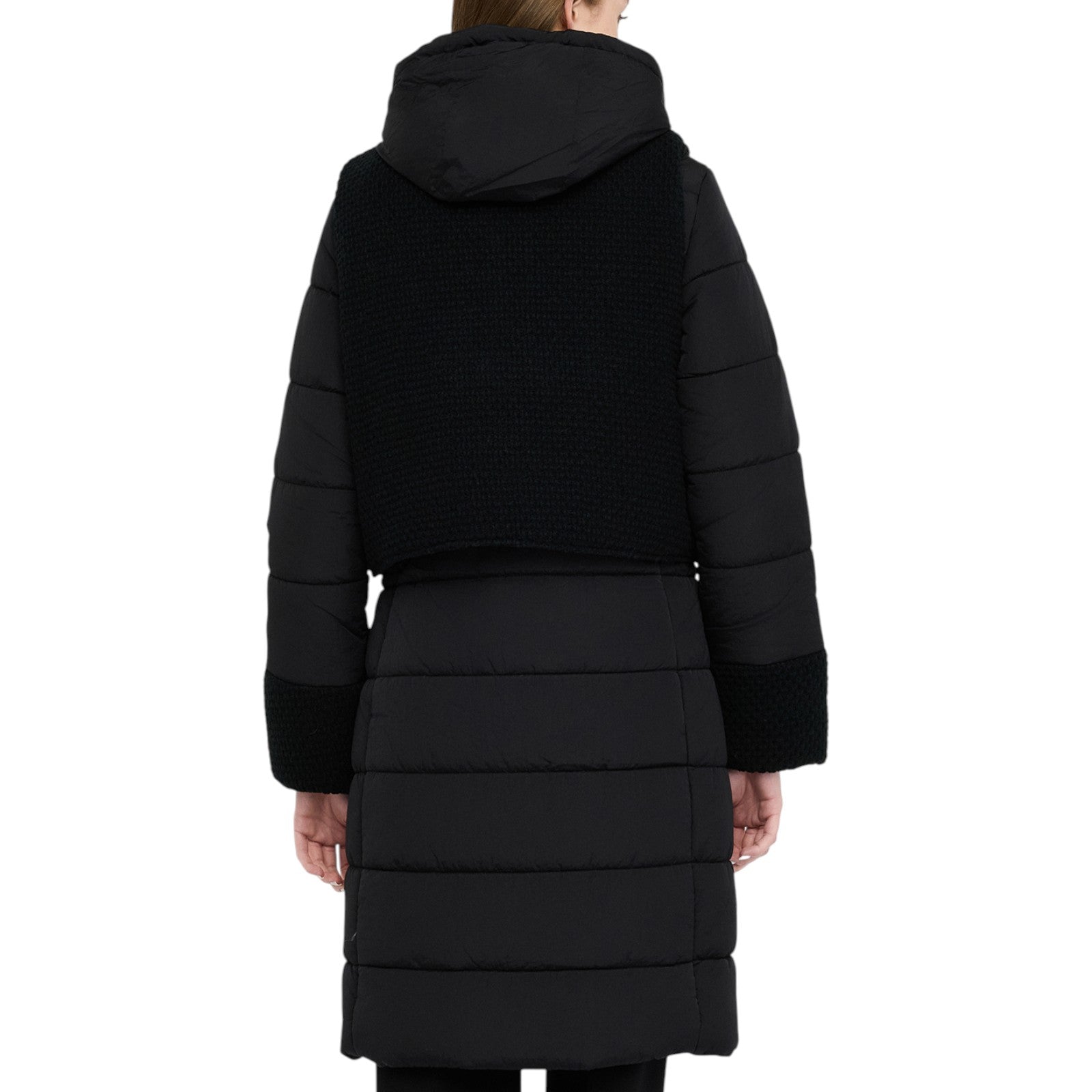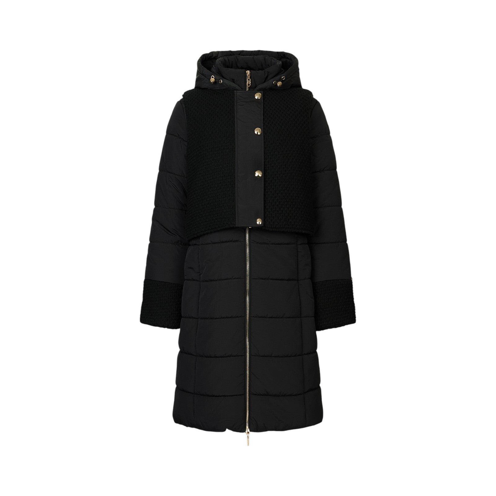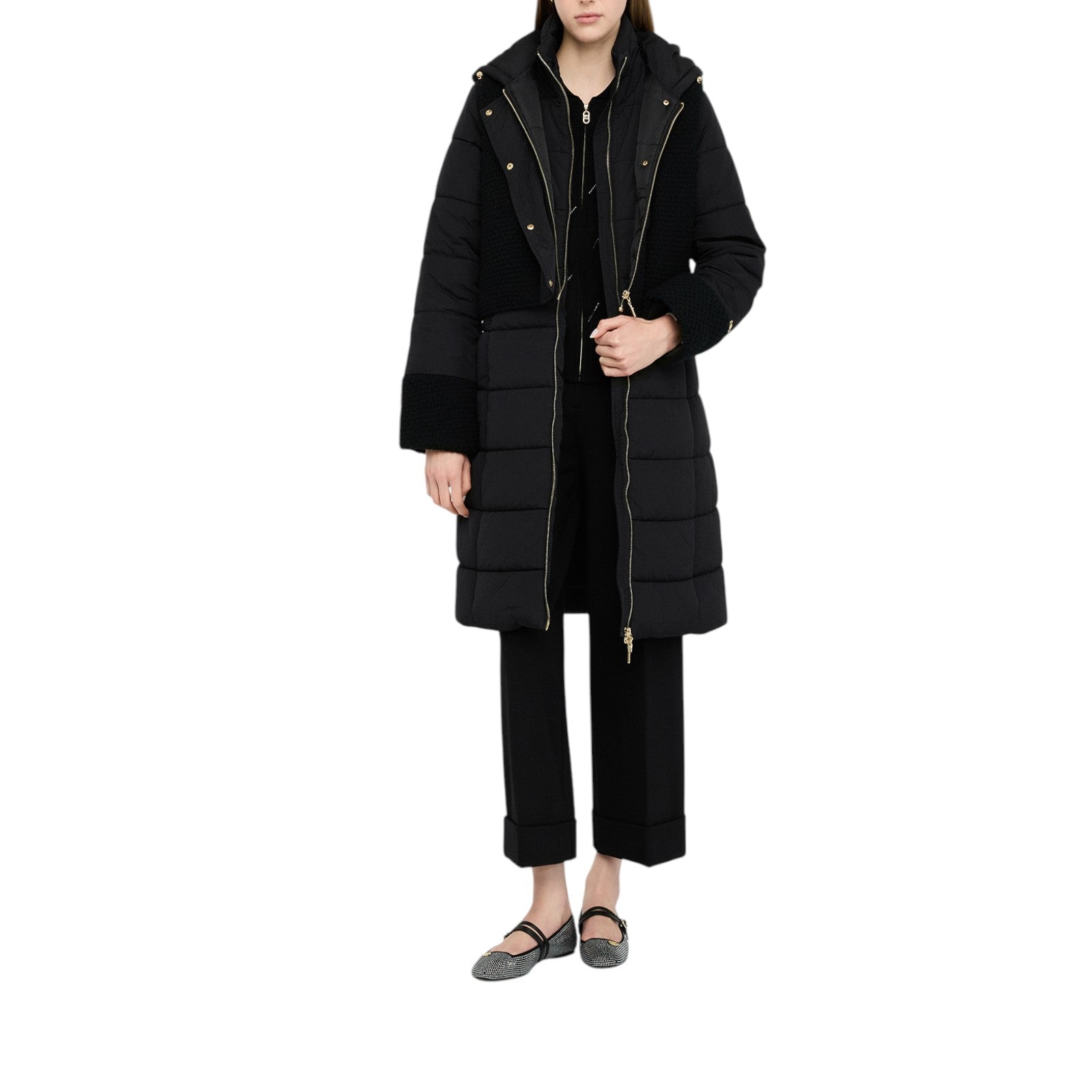 Giacca lunga in nylon trapuntato. Imbottitura in ovatta. Collo alto. Polsi con inserto in maglia. Tasche con zip invisibile sui lati. Logo LJ in metallo. Chiusura con zip a doppio cursore. Presenta gilet in maglia e nylon con cappuccio e bottoni. La modella è alta 179 cm e indossa la taglia S.