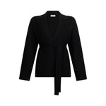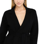Giacca in maglia. Filati in misto viscosa. Rever classico. Cintura ton sur ton. La modella è alta 180 cm e indossa la taglia S.