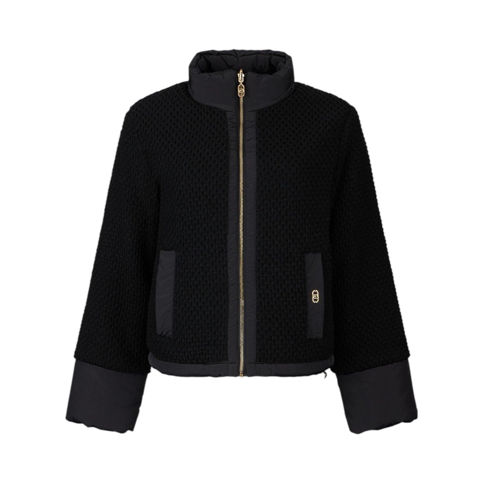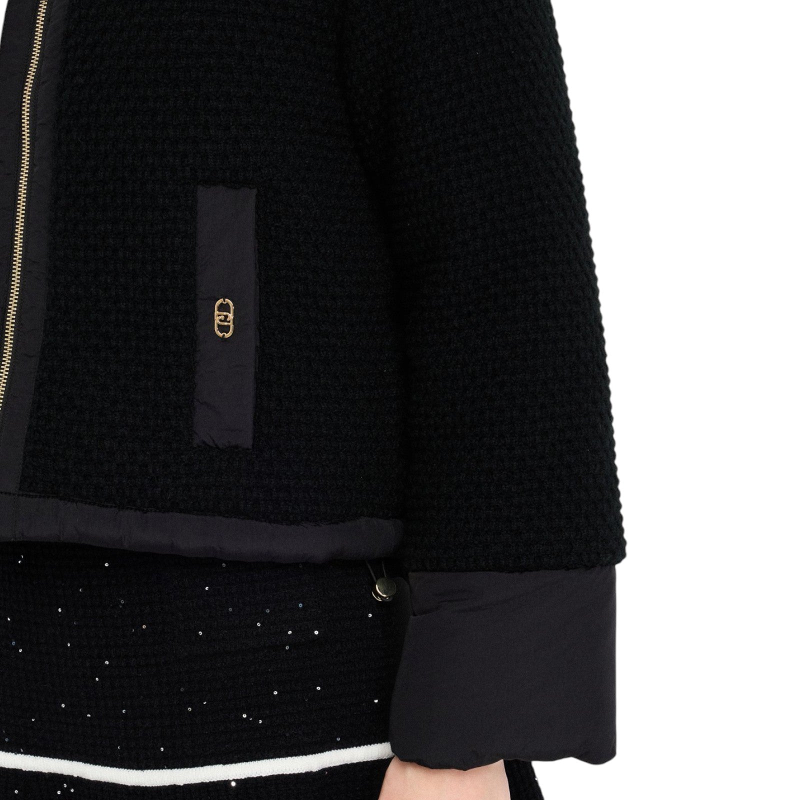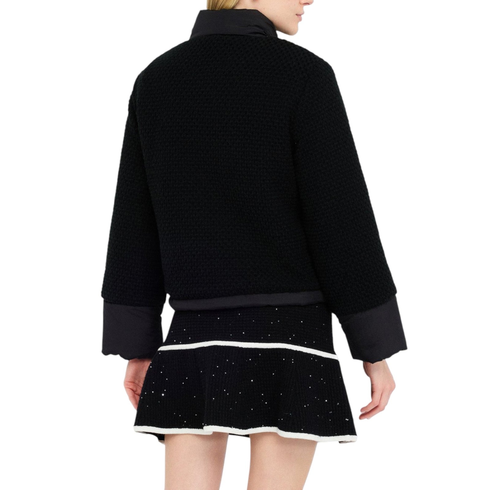 Giacca nera. Realizzata in nylon trapuntato. Imbottitura in ovatta. Sovrapposizione rimovibile in maglia. Collo alto. Tasche sui lati. Elastico con coulisse laterali al fondo. Tirazip logata. Logo in metallo. Chiusura con zip. La modella è alta 180 cm e indossa la taglia S.