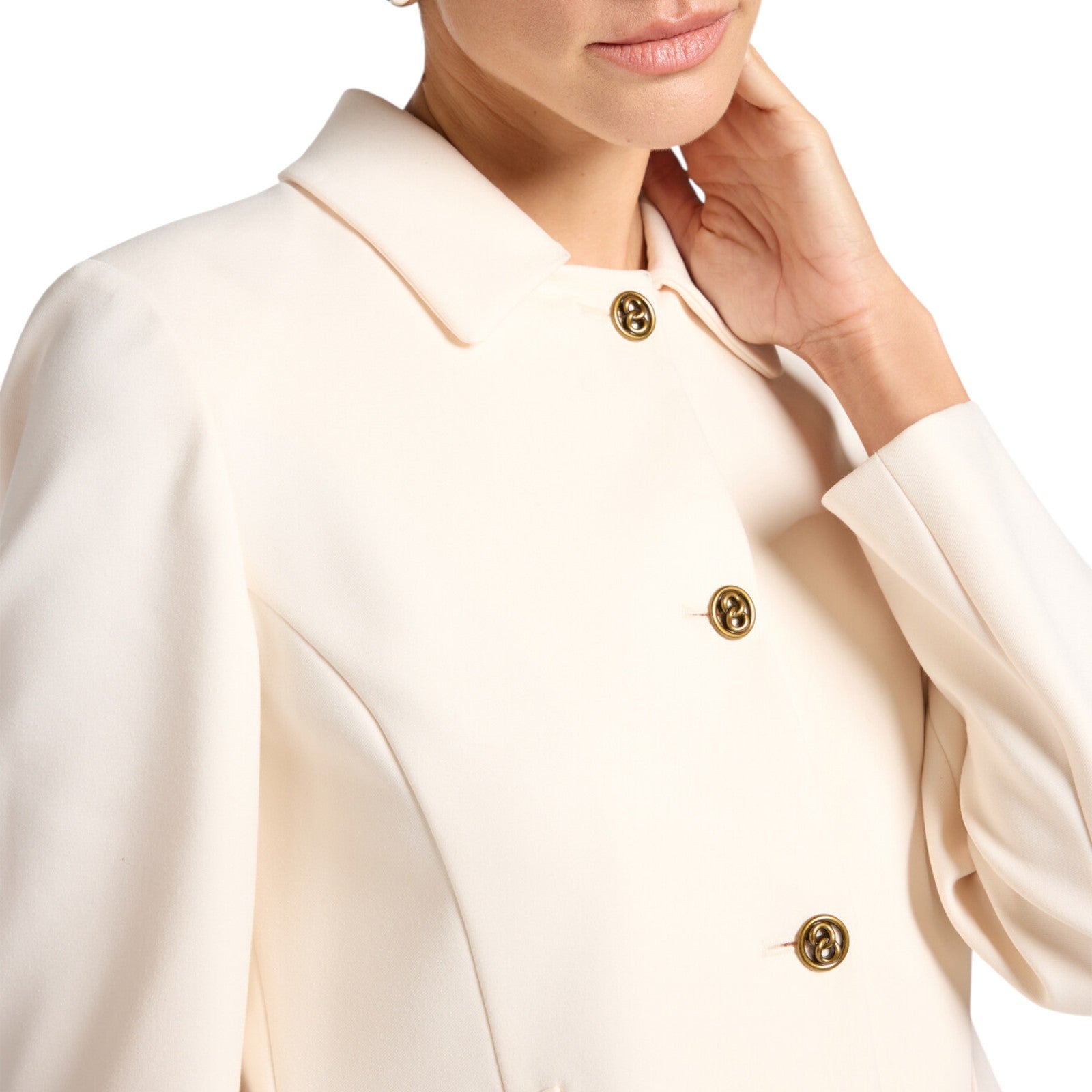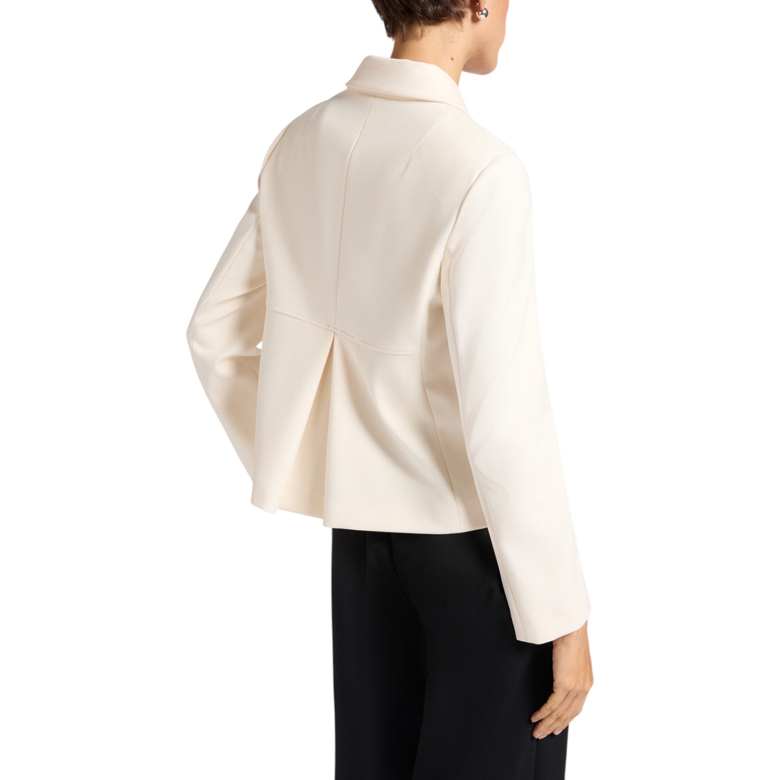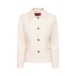 Giacca sartoriale in tessuto diagonale con colletto e bottoni, linea sciancrata. Tasche con patte.