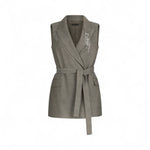 Gilet in misto viscosa stretch. Motivo chevron. Spilla con pendenti e strass. Revers a lancia. Tasche con patta. Spacco sul retro. Logo in metallo sul retro. Cintura sur ton in abbinamento. Chiusura doppiopetto. Fodera interna.
