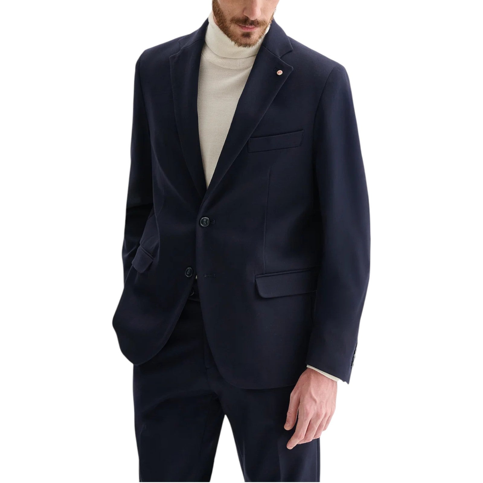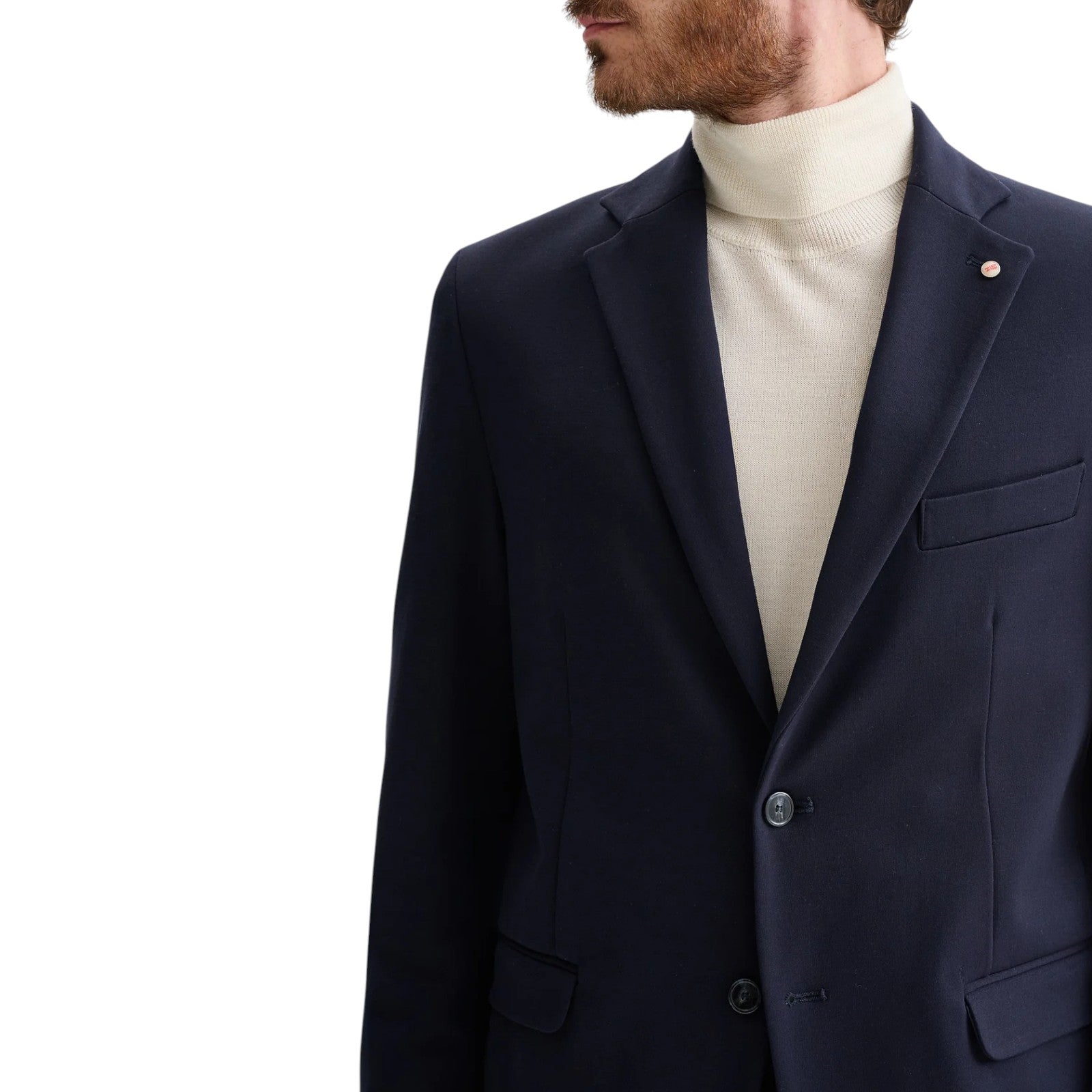 Giacca due bottoni da completo, realizzata in tessuto a maglia Punto Milano. Collo con revers classici.