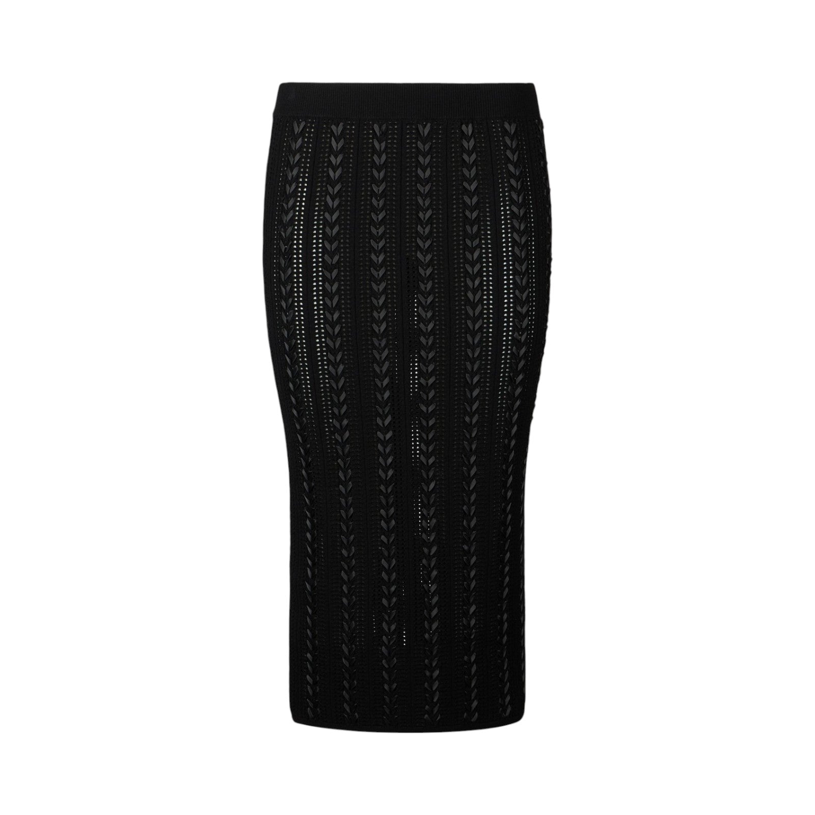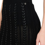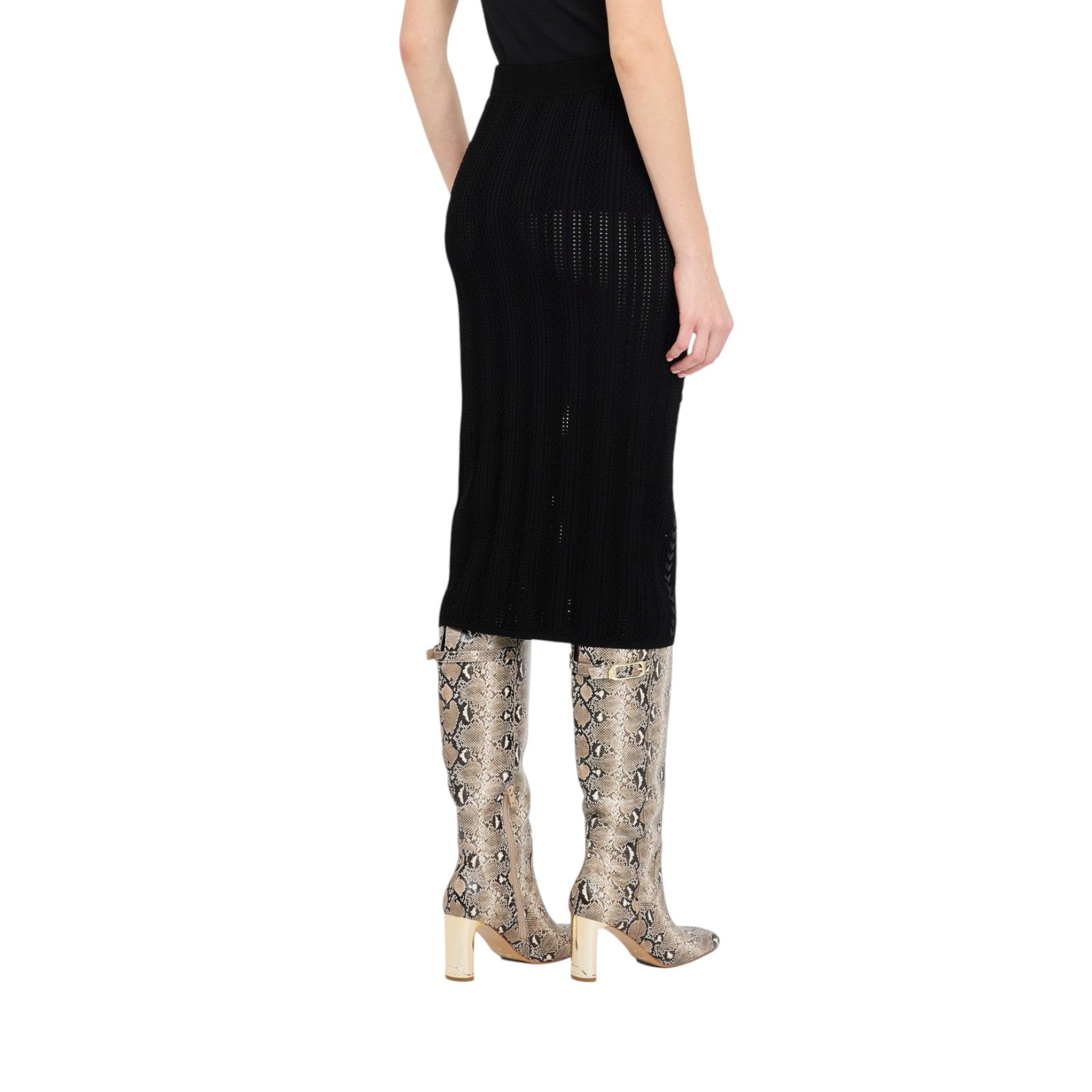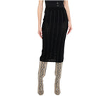 Gonna longuette in maglia di misto viscosa. Lavorazione punzonata. Nastri intrecciati. Cintone elastico. Logo in metallo. La modella è alta 180 cm e indossa la taglia S.