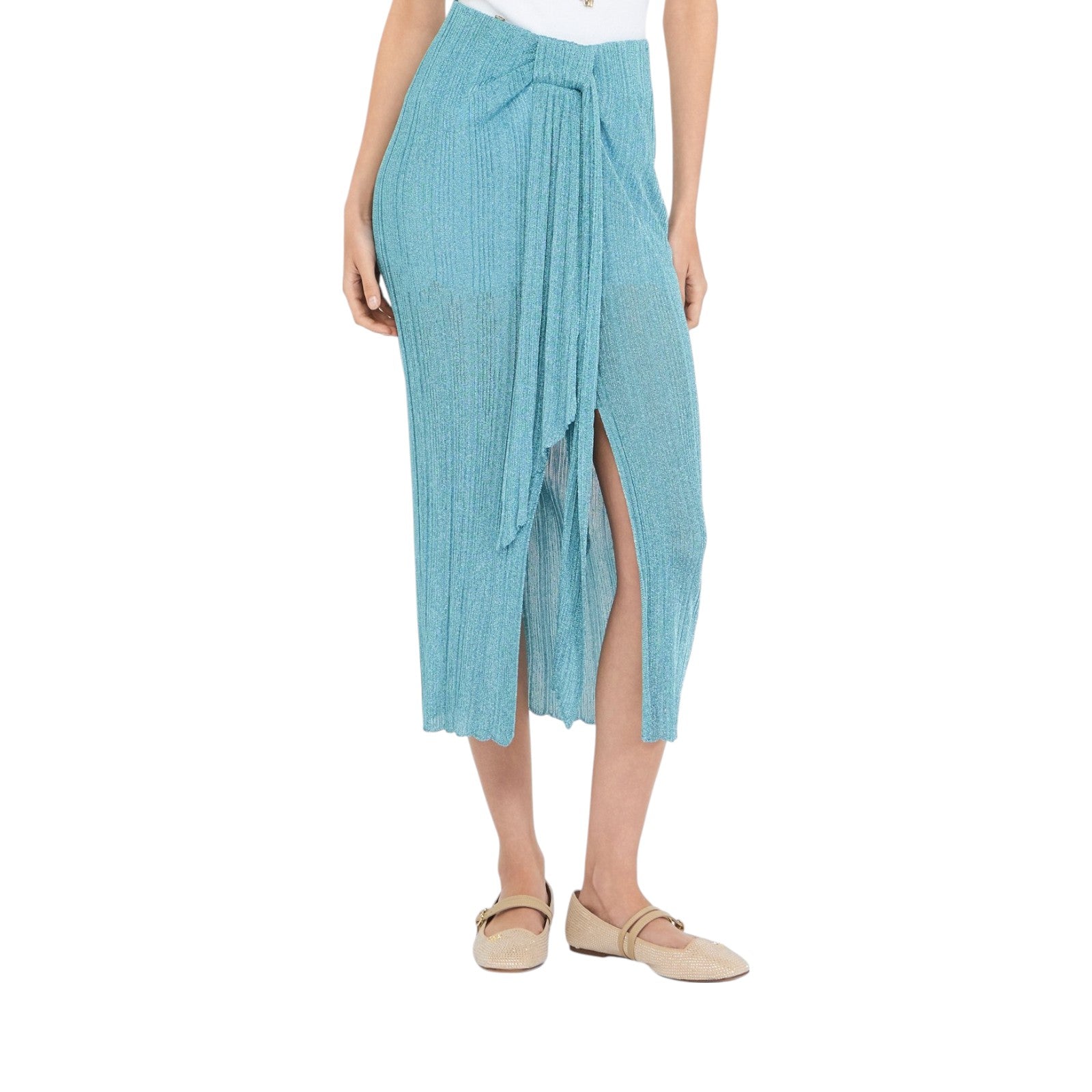 Gonna longuette in maglia di viscosa e lurex®. Lavorazione a costine. Motivo nodo in vita sul davanti. Logo in metallo sul retro. Prodotto "Liu Jo Better".