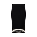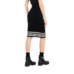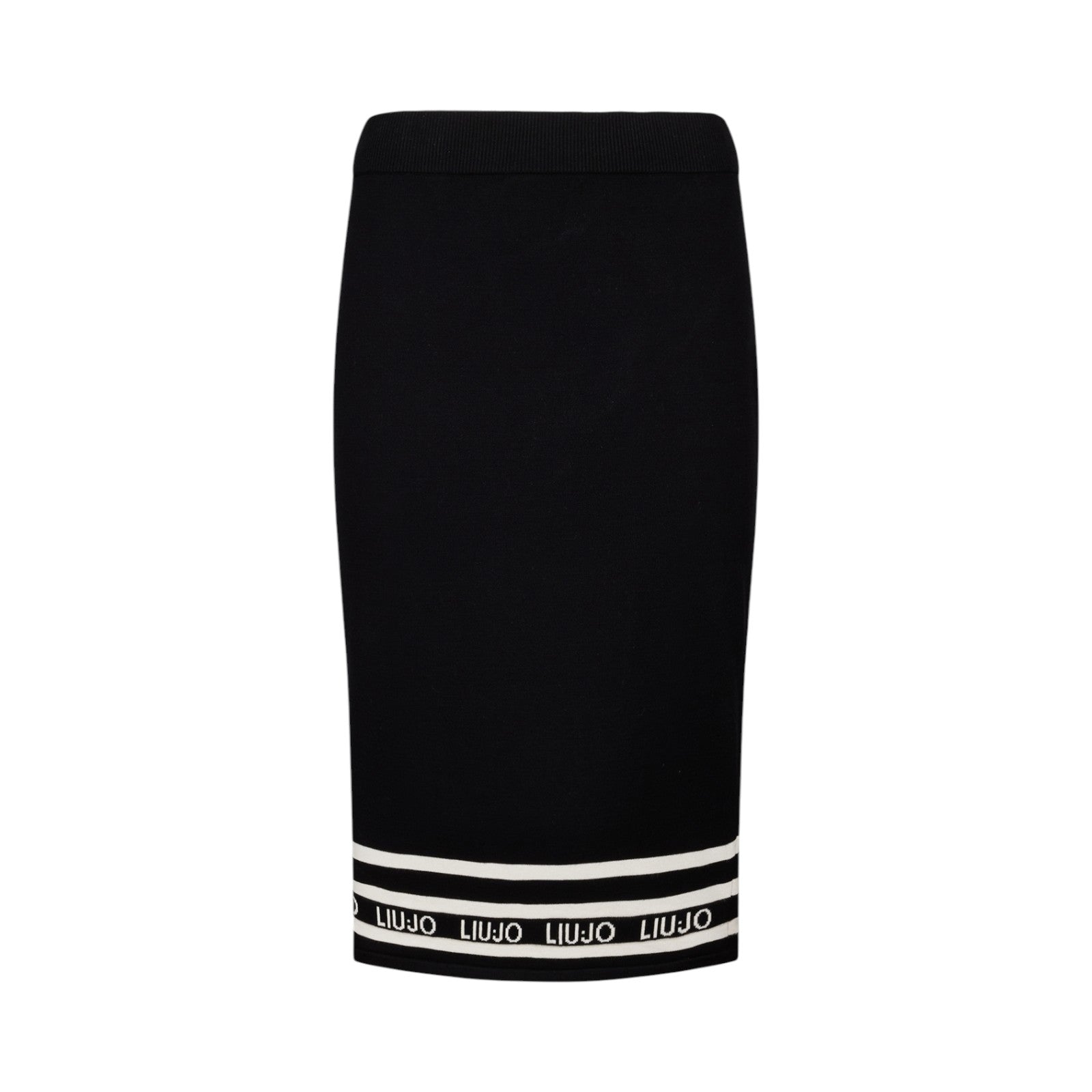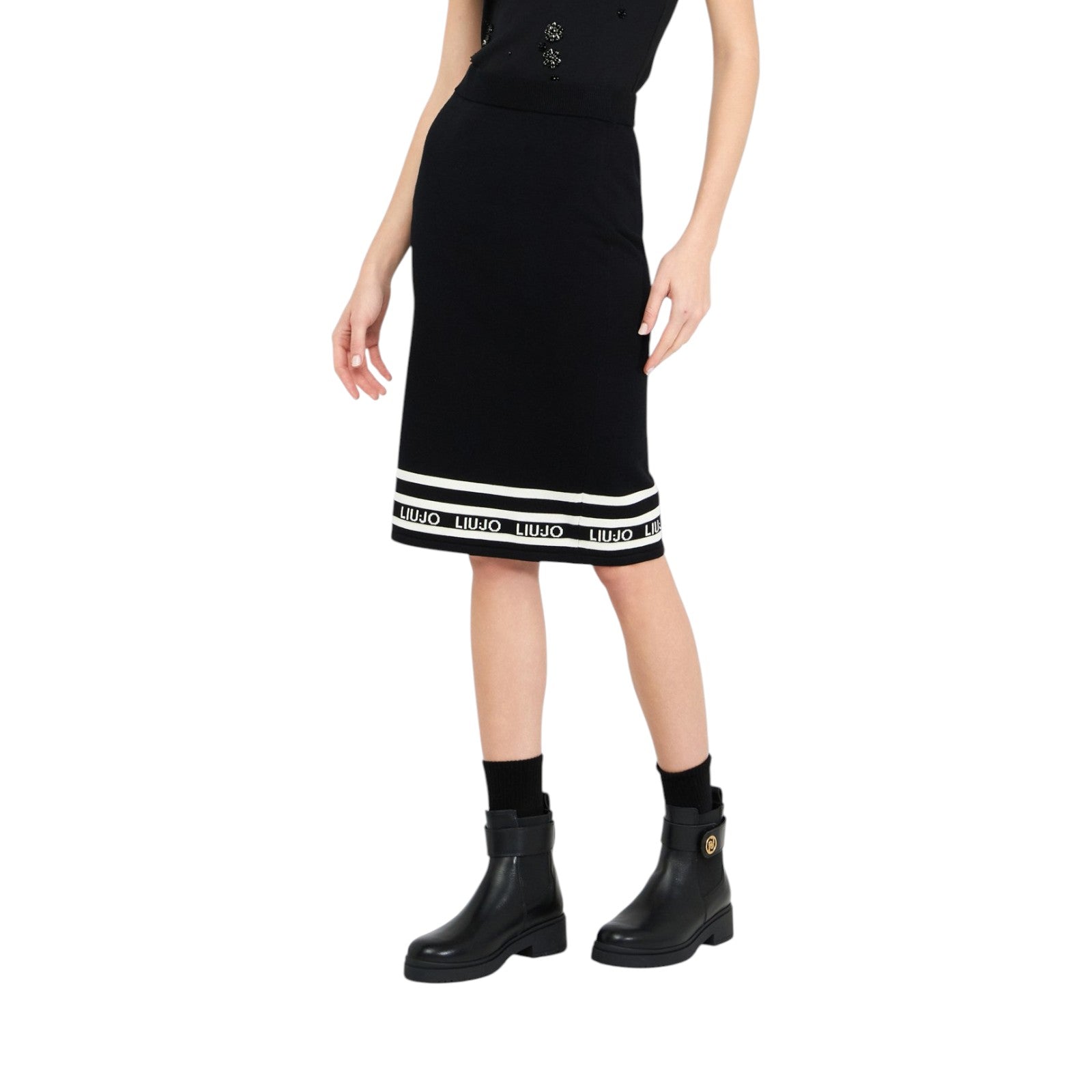 Gonna longuette nera. Realizzata in maglia di misto viscosa. Cintone elastico in vita. Motivo a righe con logo jacquard. Prodotto "Liu Jo Better".