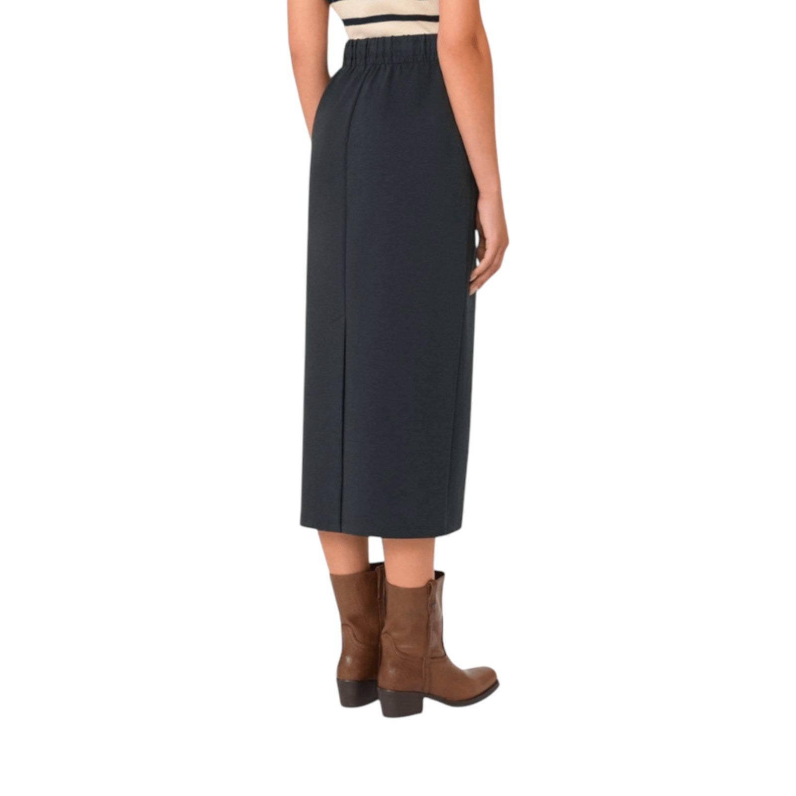 Gonna in jersey di cotone e lyocell a punto Milano. Linea dritta. Vita elasticizzata in popeline con coulisse. Tasche alla francese sui fianchi. Sfoderata.