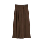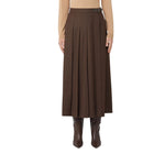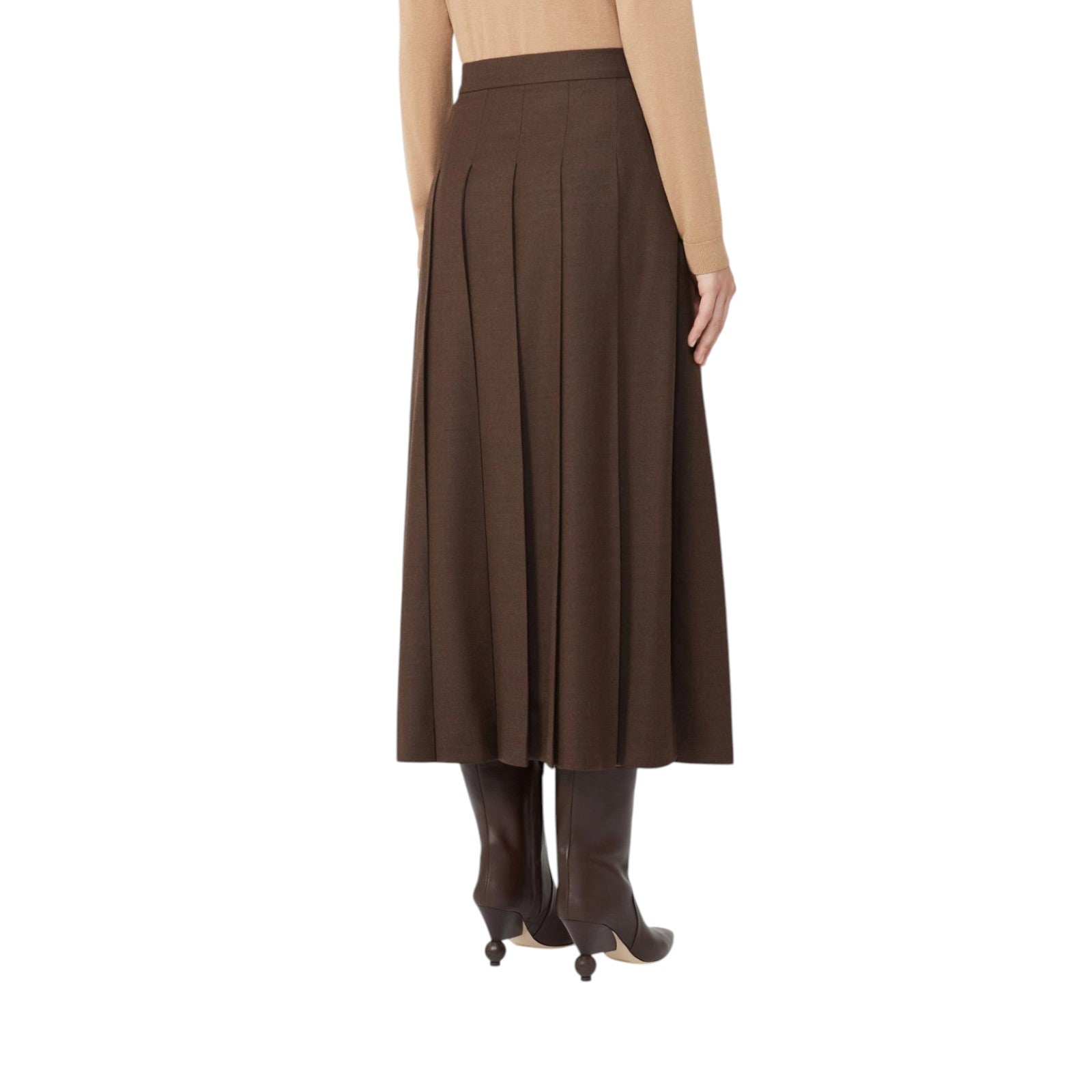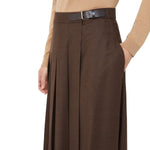 Gonna in morbida flanella di lana. Linea svasata. Chiusura con cinturino e fibbia laterale sul fianco sinistro. Tasche inserite nei fianchi. Spacchi laterali al fondo. Sfoderata.