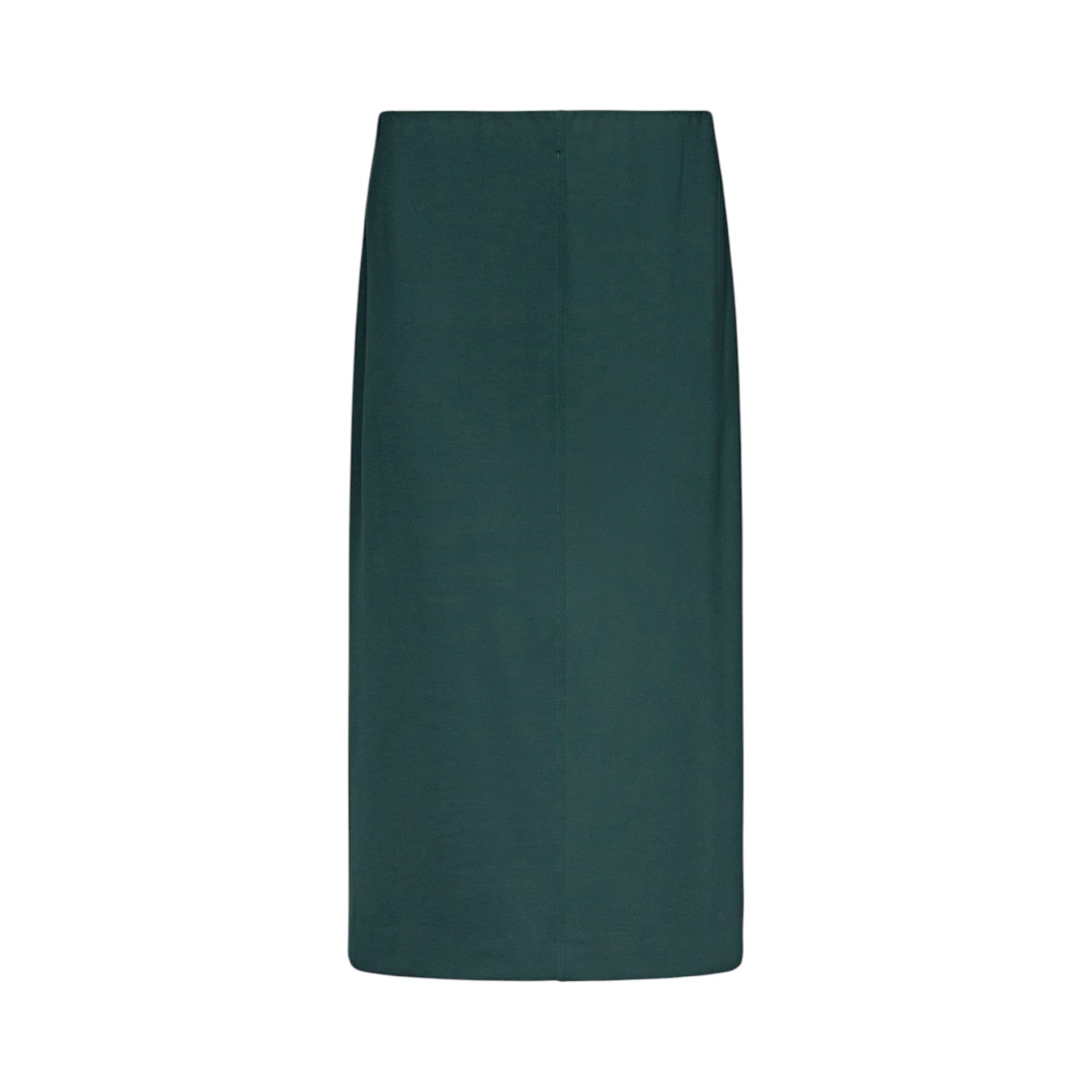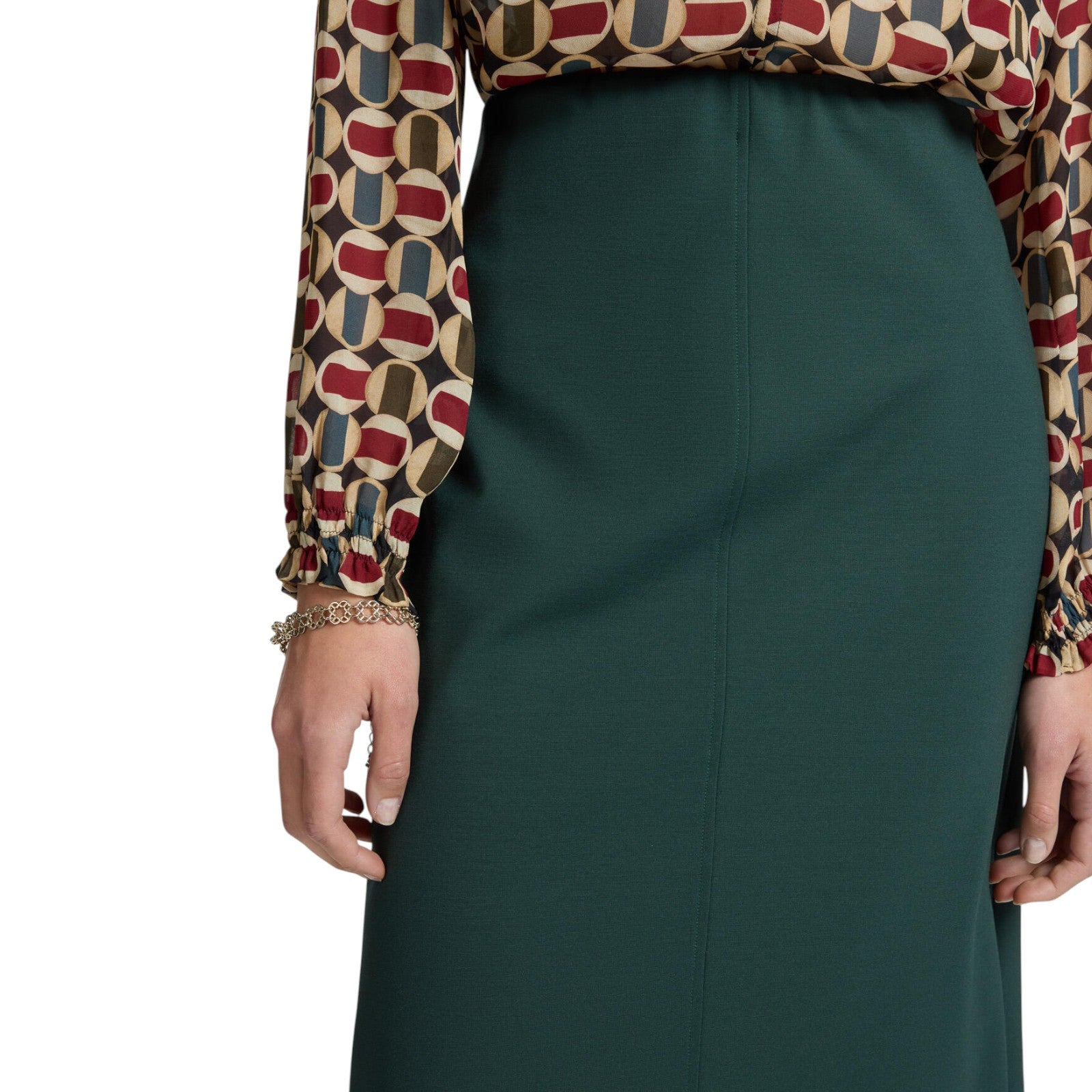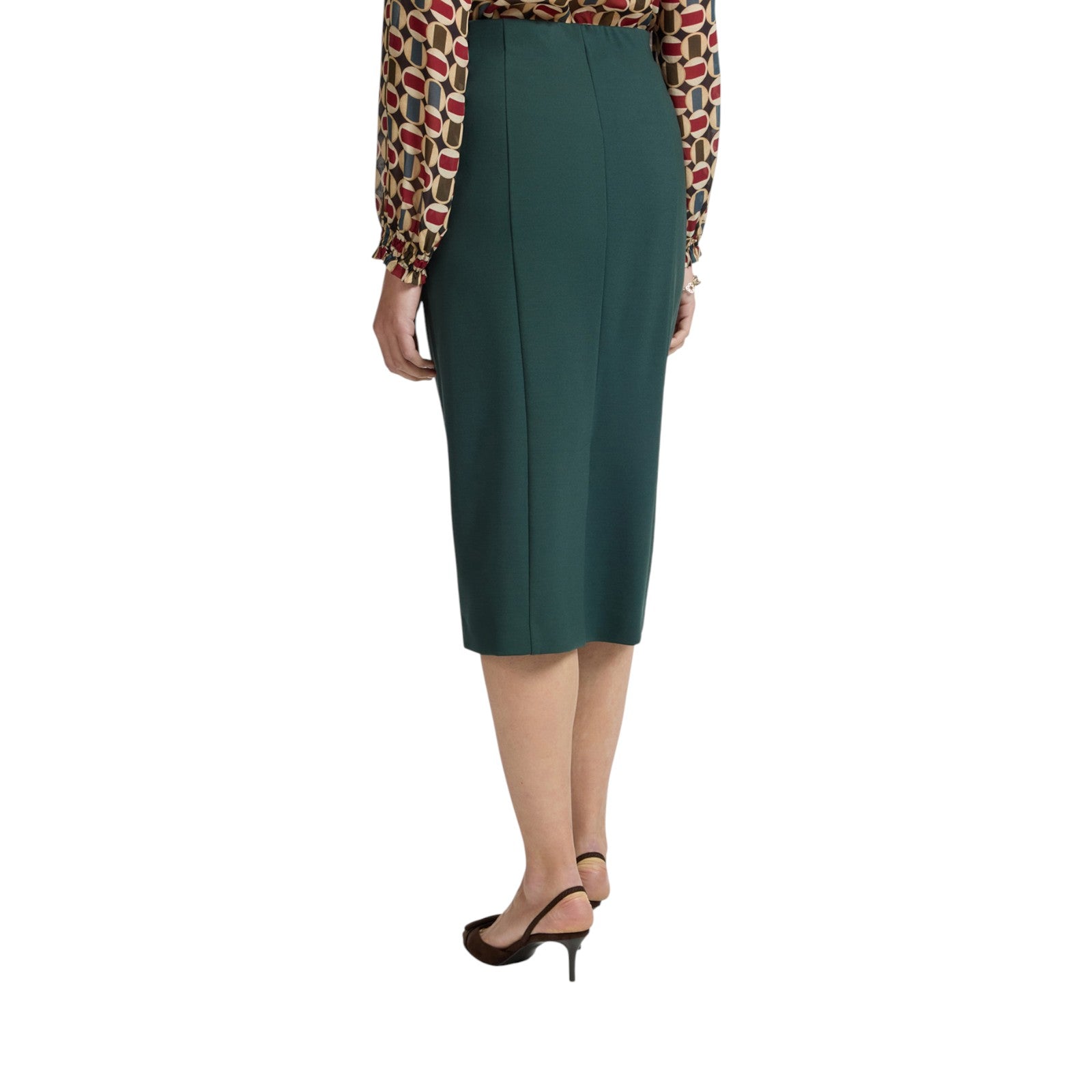 Gonna tubino in punto Milano dalla lunghezza midi. Tagli verticali e zip posteriore, elastico interno in vita.