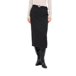 Gonna longuette in misto viscosa. Vita alta. Comode tasche. Tasca a filetto sul dietro. Spacchetto sul dietro. Cintura con fibbia gioiello.