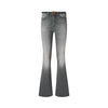 Jeans cinque tasche flared-fit, con gamba aderente fino al ginocchio e svasata al fondo, realizzati in power stretch denim grigio scuro di cotone parzialmente riciclato con scoloriture. La tela utilizzata è un denim high recovery che non si deforma facilmente e che conserva la sua tenuta originale nel tempo. A personalizzare il design in puro stile PINKO troviamo il logo lettering ricamato sul retrocinta, e il logo Love Birds, presente sotto forma di ricamo sulla tasca posteriore destra e sotto forma di rivetto sul quinto taschino. Completo di cintura abbinata nello stesso tessuto con fibbia Love Birds Diamond Cut in metallo. Vita media con passanti per cintura, chiusura con zip e bottone.