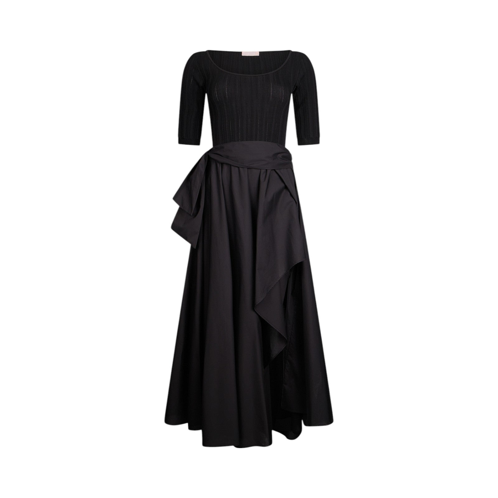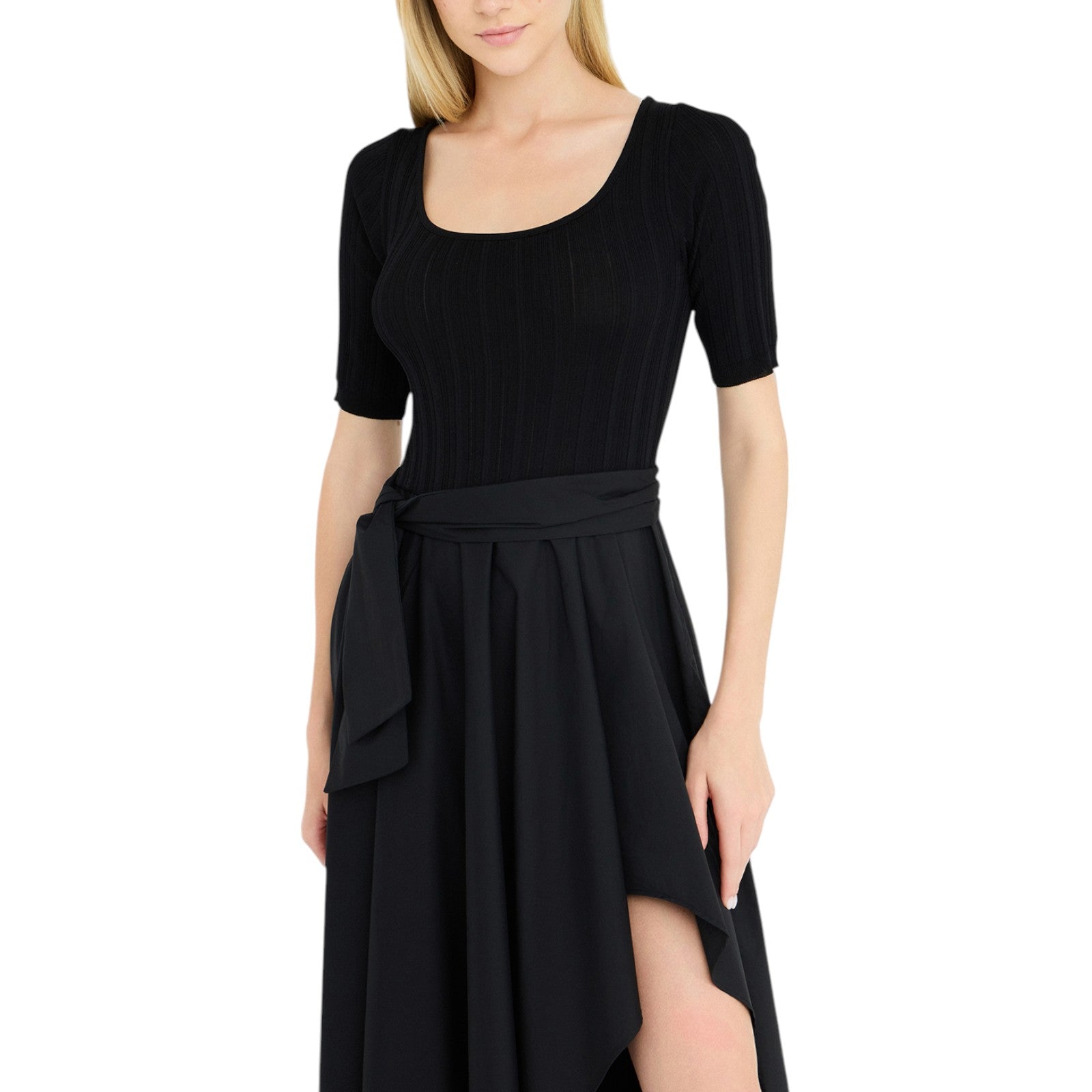 Abito corto con top in maglia. Lavorazione a coste. Girocollo. Fondo balloon in popeline.