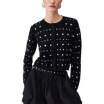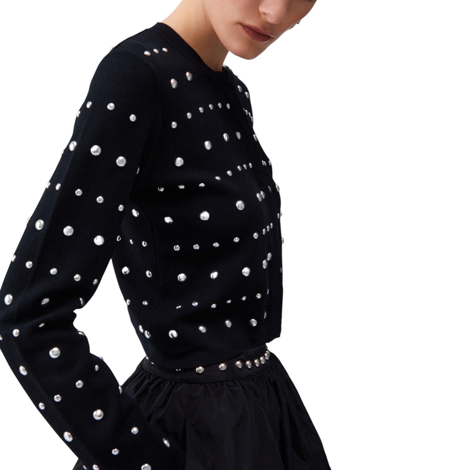 Cardigan in maglia. Filati in misto viscosa. Borchie applicate all-over. Girocollo. Chiusura con bottoni a pressione nascosti. La modella è alta 180 cm e indossa la taglia S.