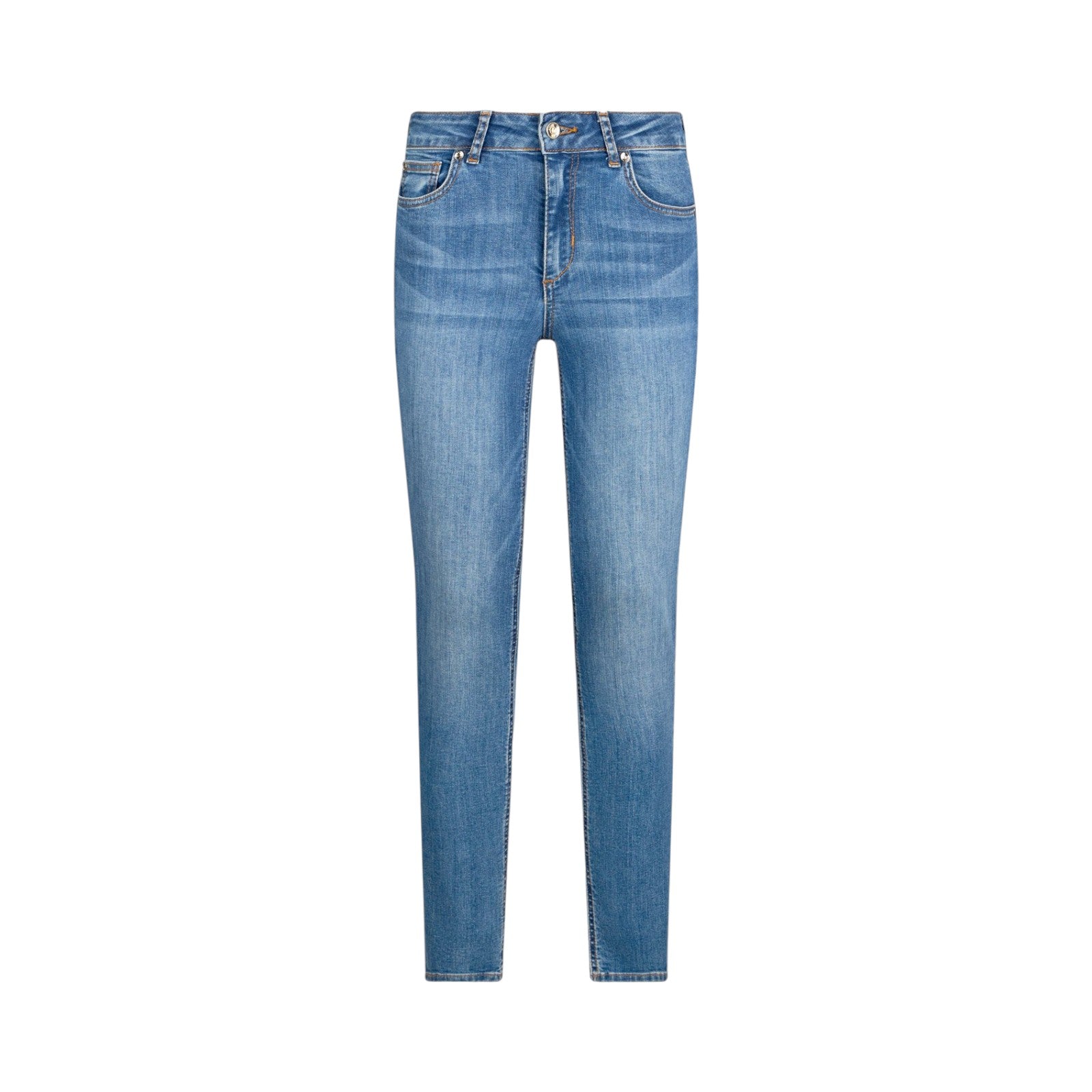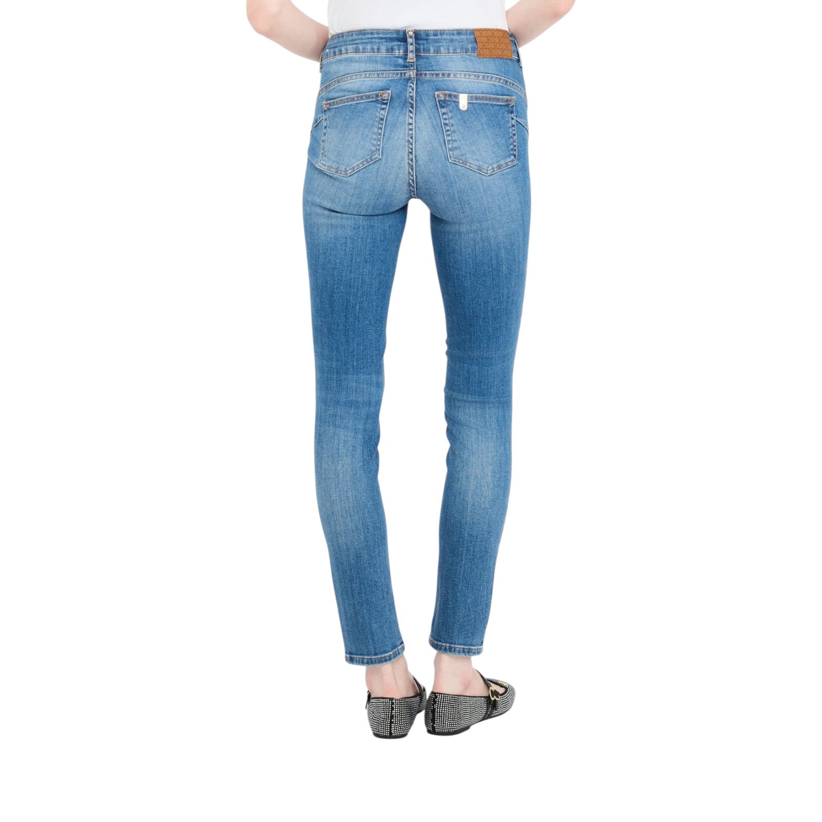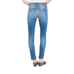 Jeans in denim di cotone stretch. Tagli bottom up. Lavaggio used. Vita alta. Gamba skinny. Modello cinque tasche. Salpa logata. Logo in metallo. Chiusura con bottone e zip nascosta.