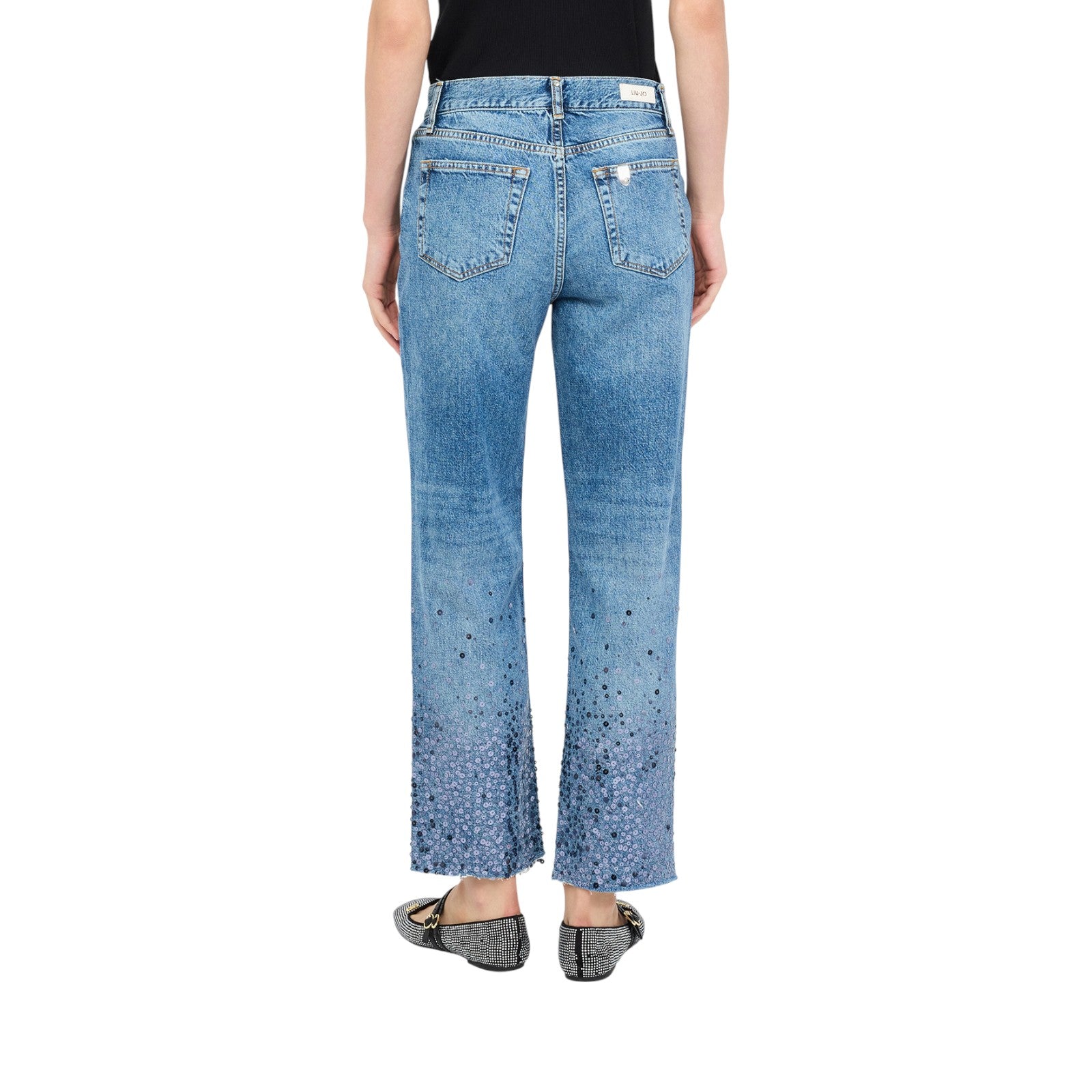 Jeans cropped in denim di cotone. Lavaggio used con strass applicati. Vita bassa. Gamba dritta. Modello cinque tasche. Salpa logata. Logo in metallo sul retro. Orlo sfrangiato. Chiusura con bottone e zip coperta.