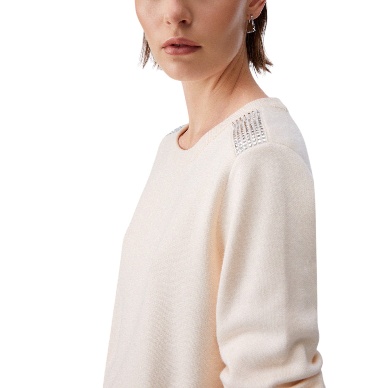 Maglia beige da donna. Filati in misto viscosa e seta. Girocollo. Perline applicate sulle spalle.