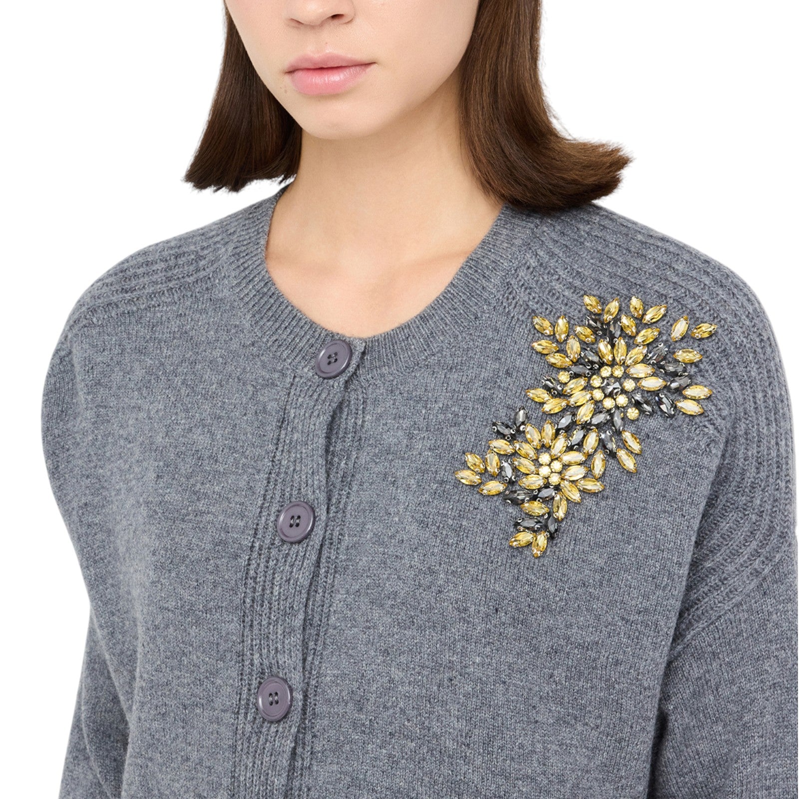 Cardigan in maglia. Filati 100% lana. Ricamo gioiello. Comode tasche sul davanti. Chiusura con bottoni.