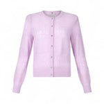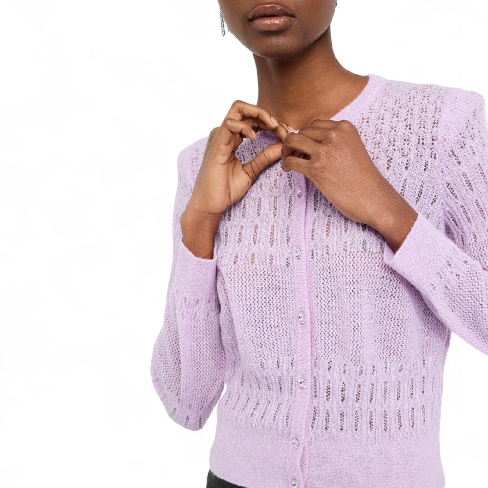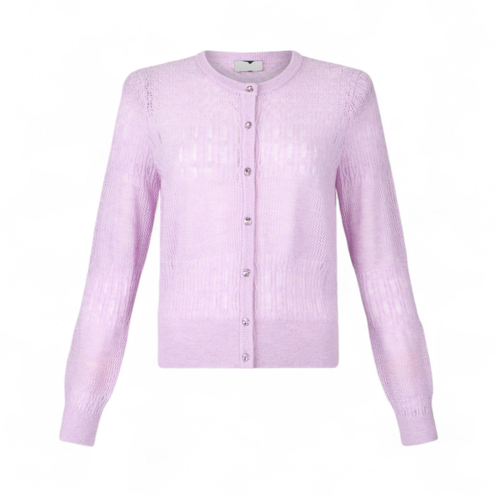 Cardigan lilla. Realizzato in maglia di misto lana e alpaca. Lavorazione punto pizzo. Taglio girocollo. Maniche lunghe. Logo in metallo sul retro. Chiusura con bottoni gioiello. La modella è alta 181 cm e indossa la taglia S.