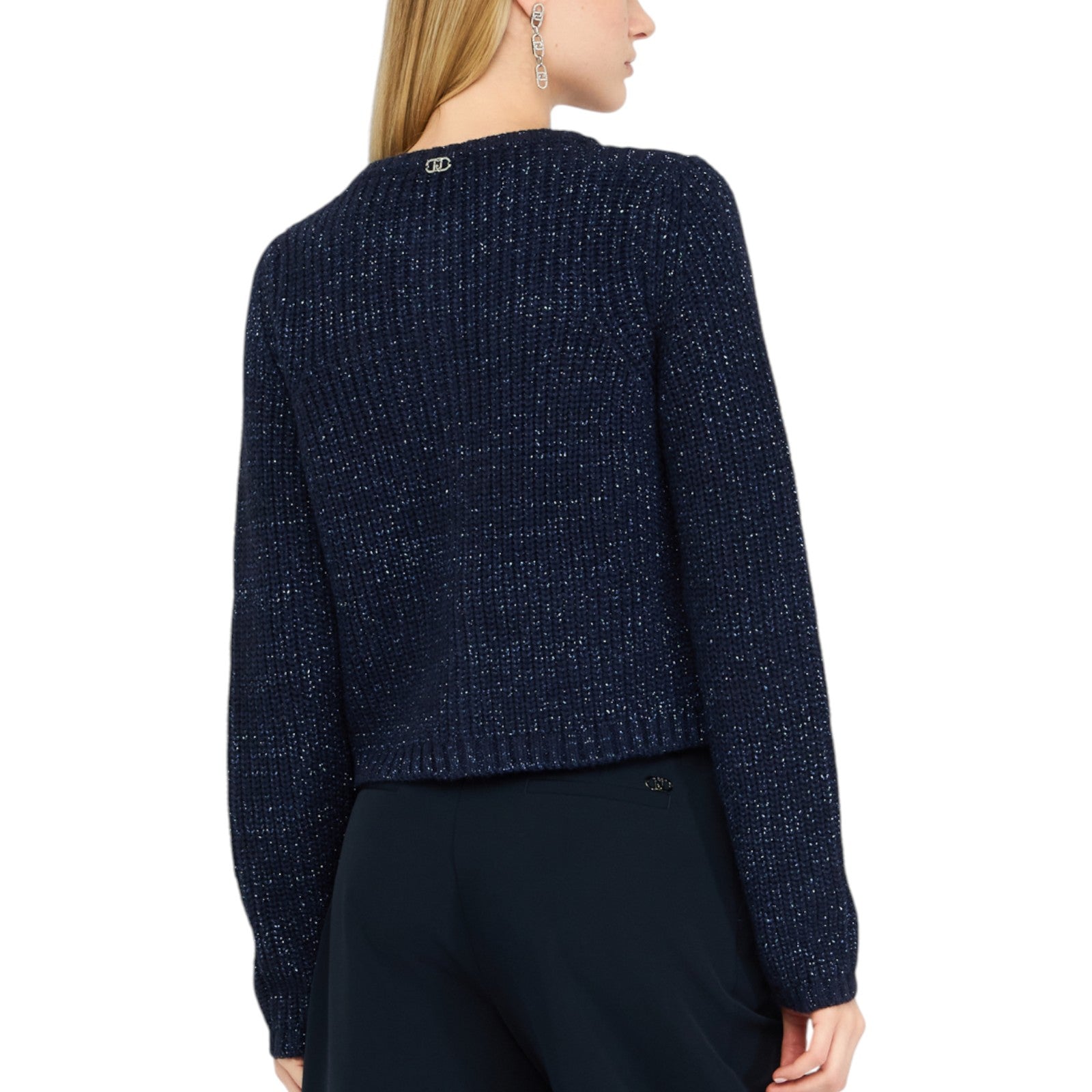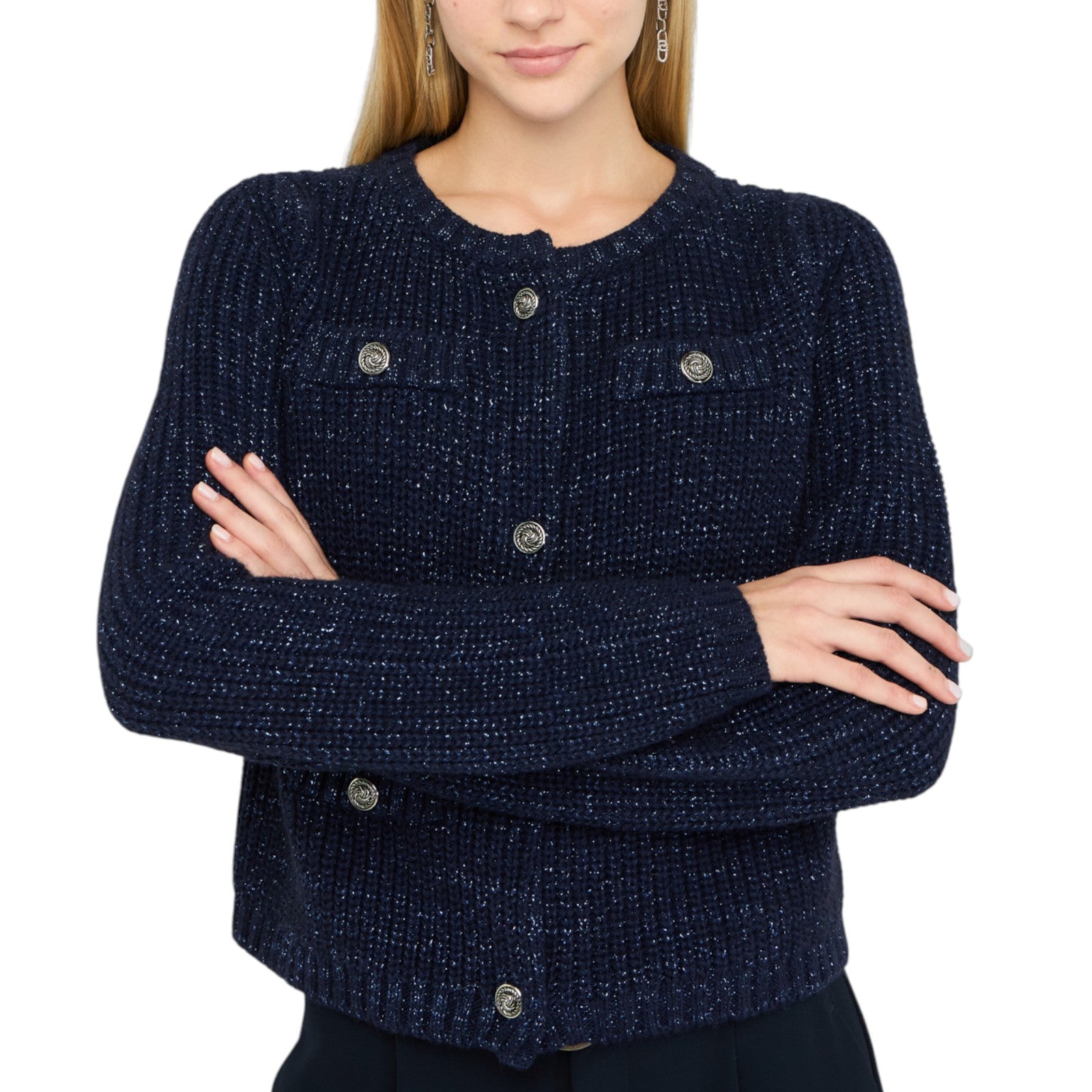 Cardigan da donna. Filati grossi in misto lana e alpaca. Interventi in lurex®. Finte tasche. Bottoni lavorati.