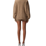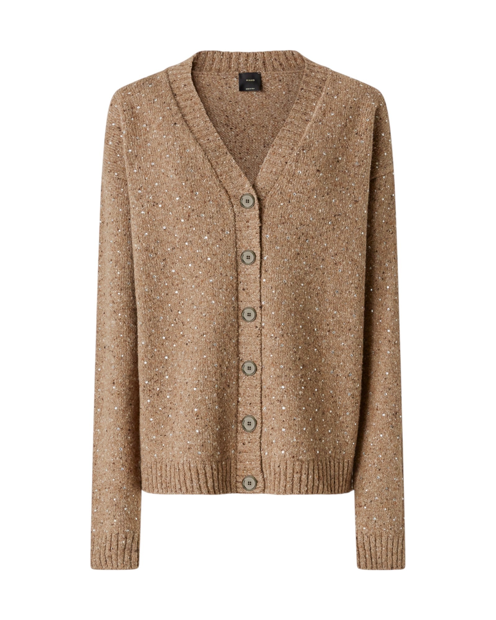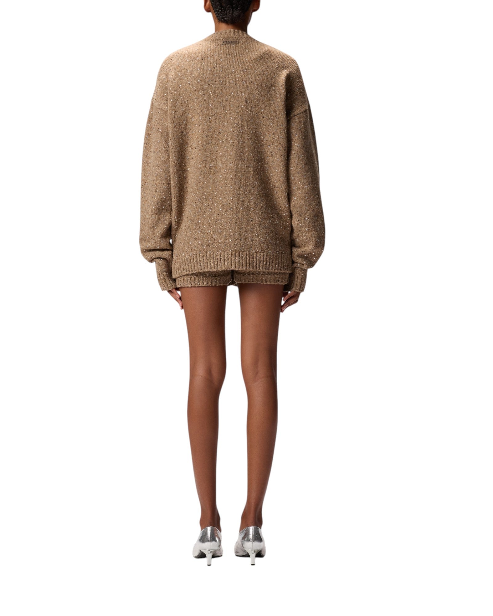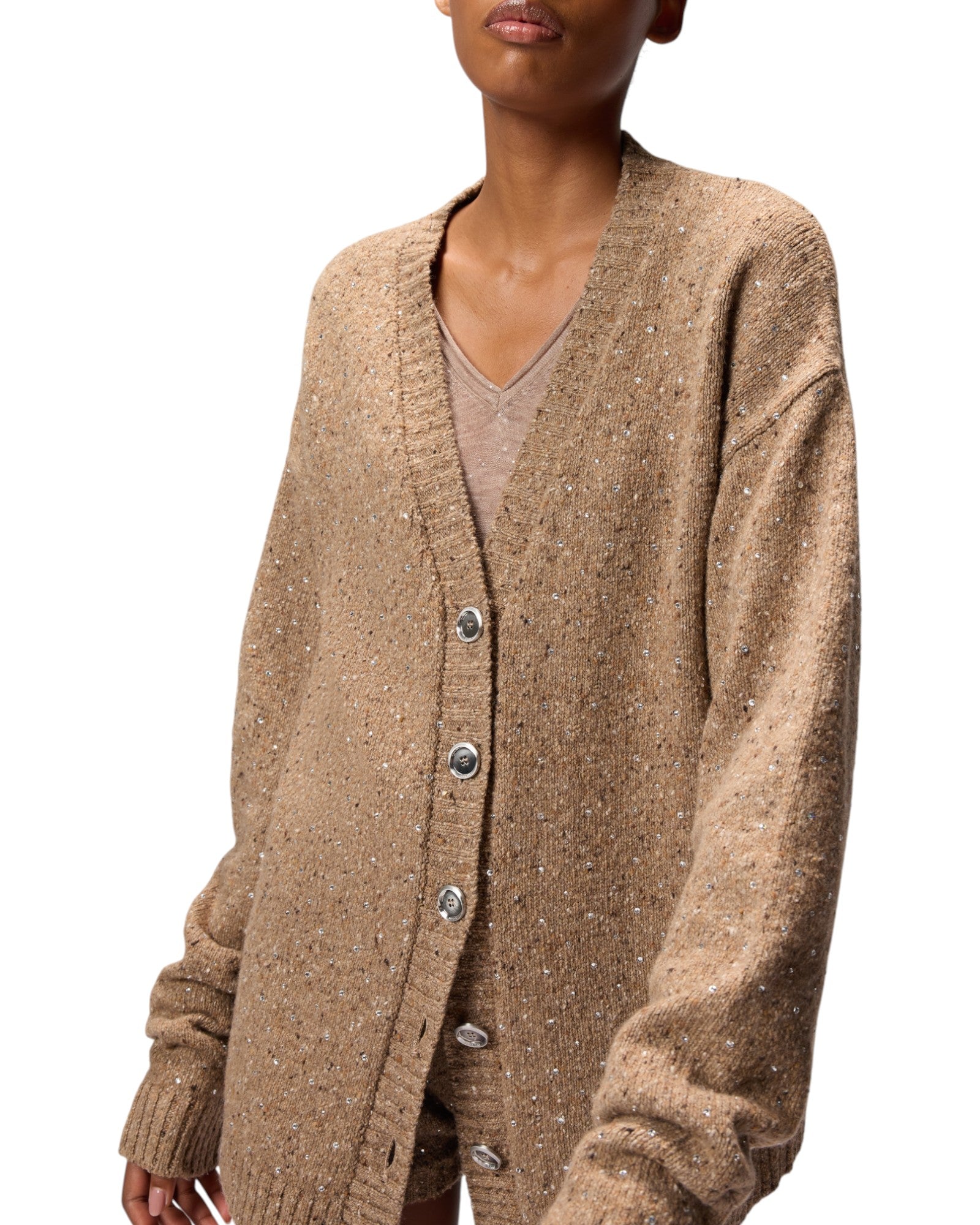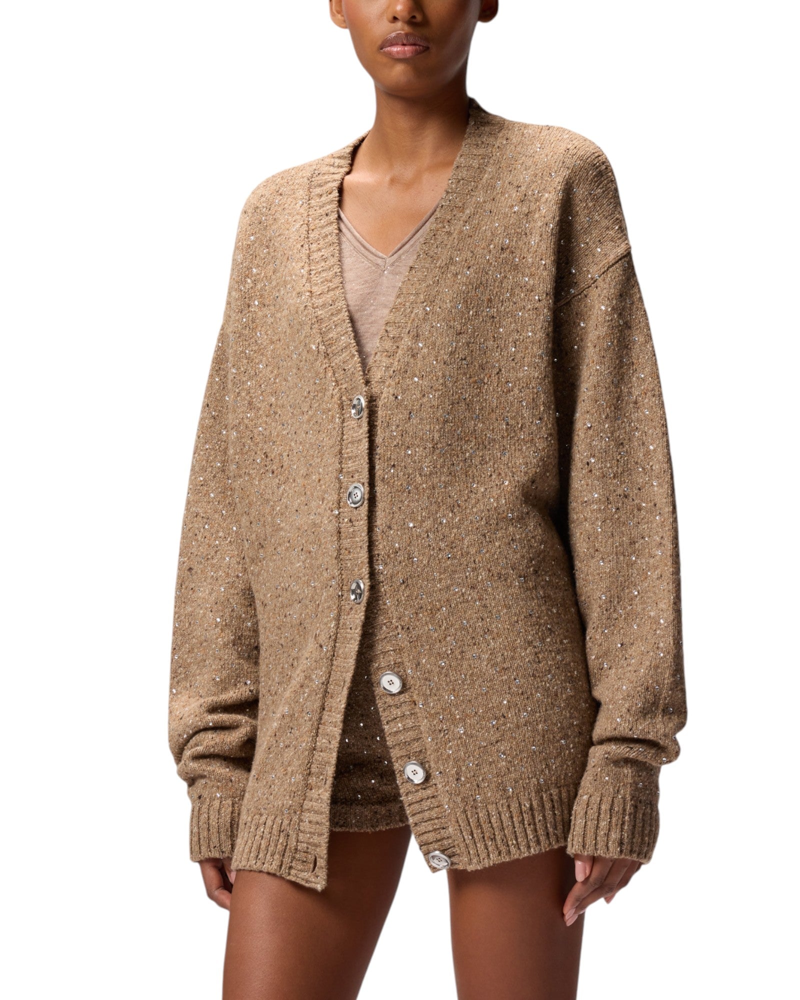 Cardigan a maniche lunghe dalla silhouette confortevole e avvolgente. Il soffice tessuto bouclé è costellato di strass che impreziosiscono il design. Orlo e polsini sono lavorati a coste, mentre dietro al collo spicca l'etichetta del brand tono su tono.