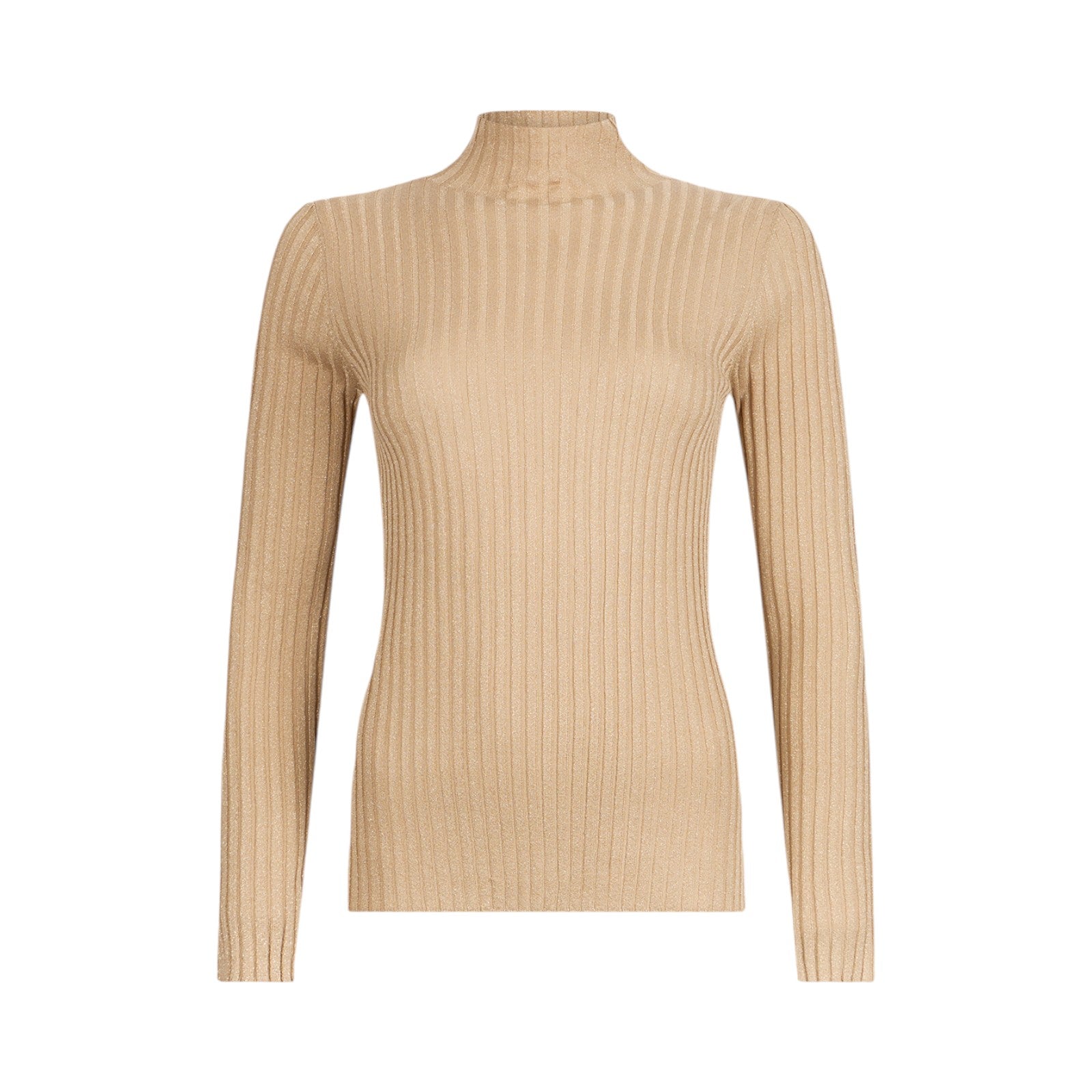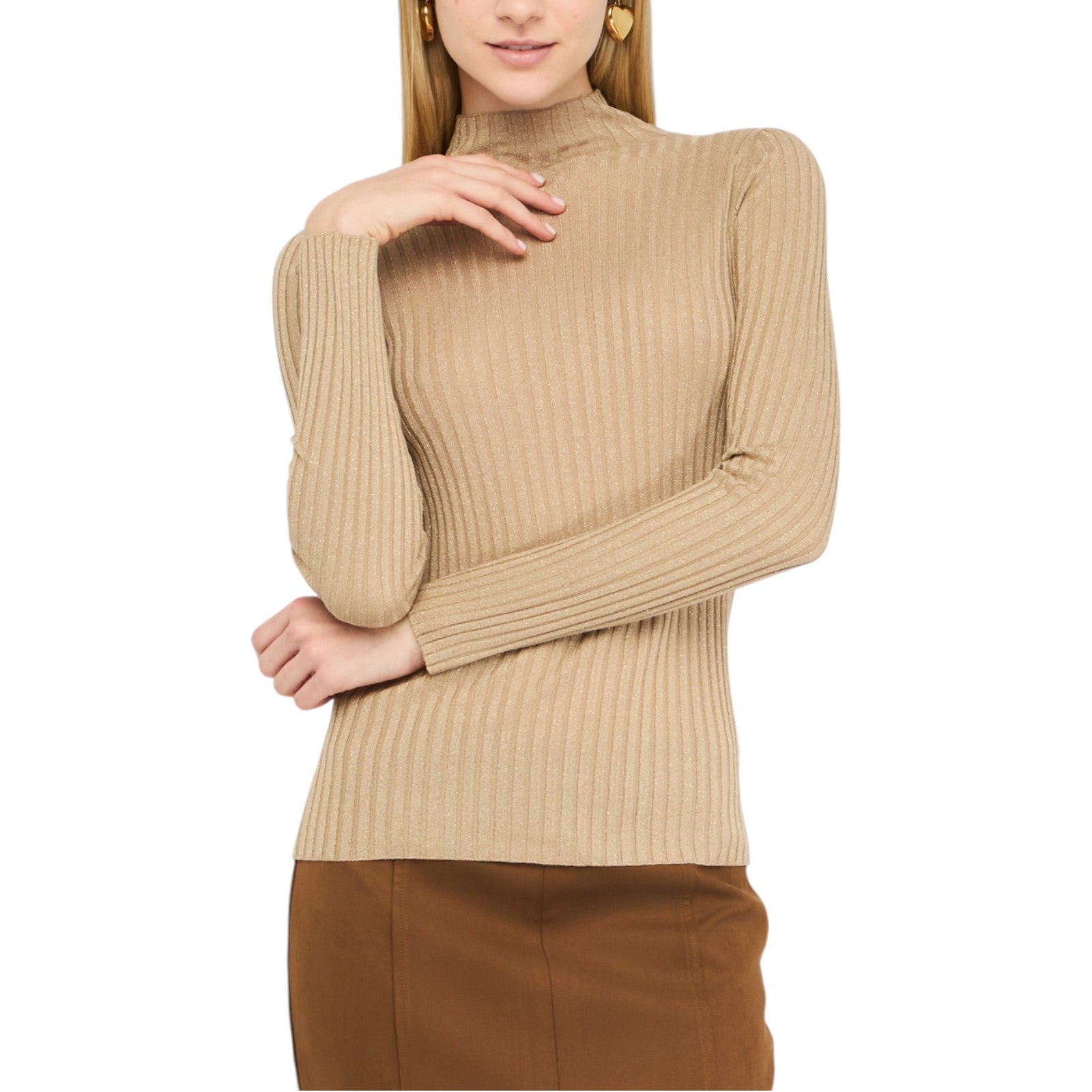 Dolcevita a coste con filati in misto viscosa. Interventi in lurex®. La modella è alta 180 cm e indossa la taglia S.