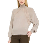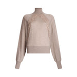 Dolcevita in lana beige. Dettagli in pizzo. Maniche raglan a palloncino. Bordi a costine. Logo LJ in metallo con strass sul retro.