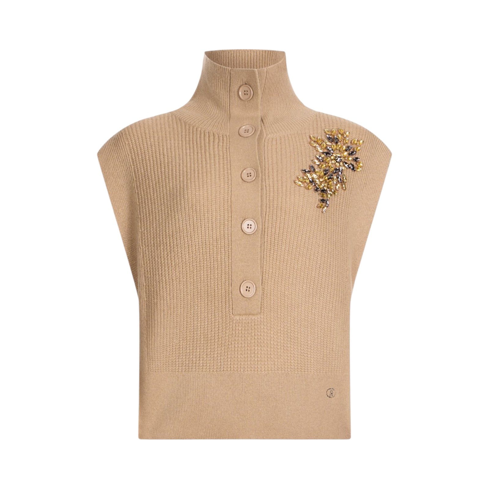 Gilet in maglia 100% lana. Chiusura con bottoni. Ricamo gioiello. Spacchetti sui lati. La modella è alta 178 cm e indossa la taglia S.