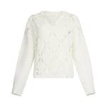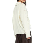 Maglia bianca in pura lana. Cut-out sul davanti. Colletto con ricami gioiello. Top in jersey in abbinamento. La modella è alta 177 cm e indossa la taglia S.