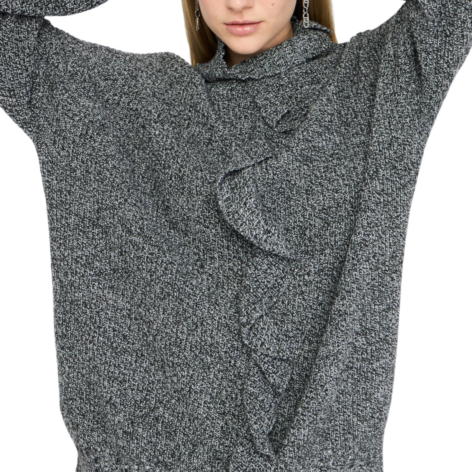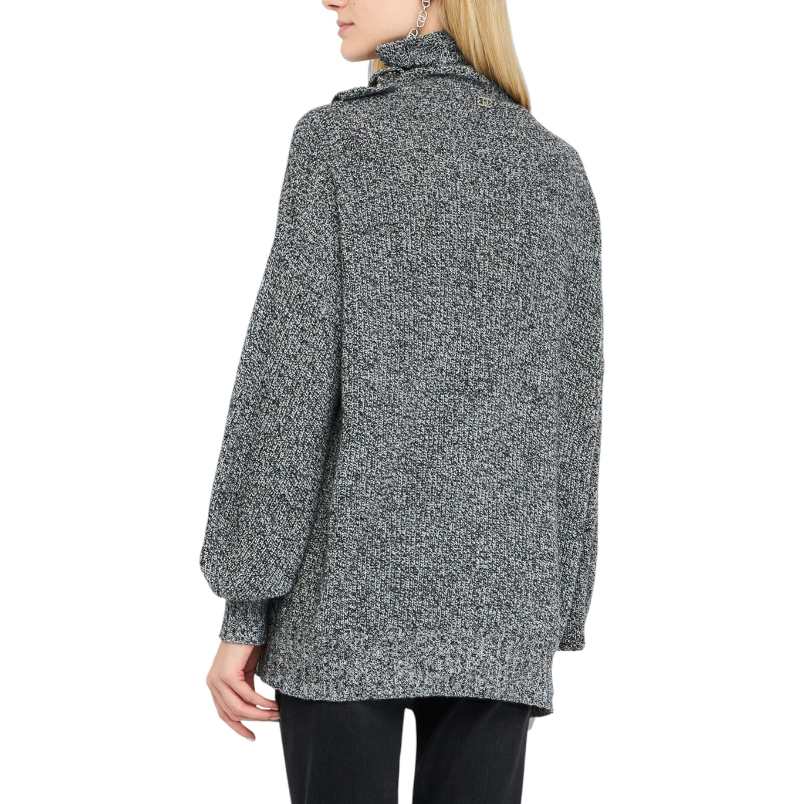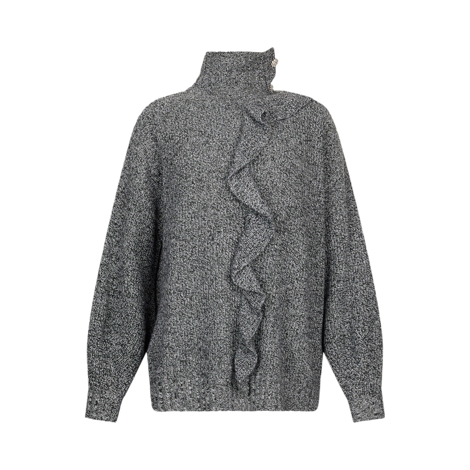 Maglia con filati mouliné in misto lana e cashmere. Collo alto con bottoni gioiello. Maxi volant in tono colore. Prodotto "Liu Jo Better".