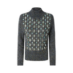 Maglia dolcevita in pregiato filato mouliné. Il frontale è impreziosito da un motivo geometrico di cristalli e perle che formano un pattern scintillante e prezioso. La silhouette fitted presenta collo alto a coste e maniche lunghe, mentre i bordi lavorati a costina definiscono la linea con eleganza sartoriale.