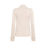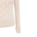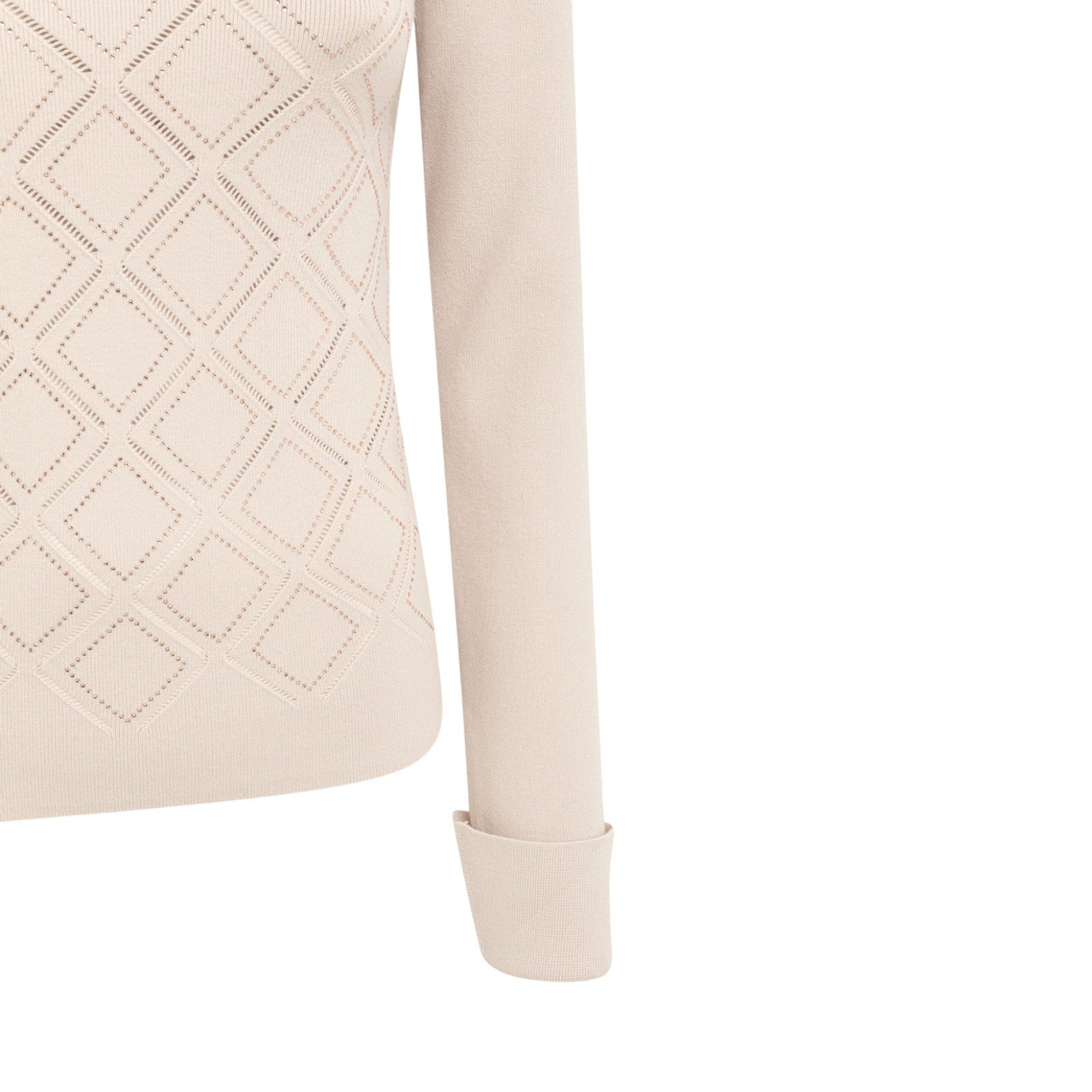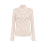 Maglia a lupetto in viscosa stretch con lavorazione a effetto punzonato che crea un motivo a rombi illuminato da strass termoadesivi. ha maniche lunghe con polso alto e spacchetti, linea fitted.