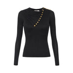 Maglia in cupro dalla vestibilità aderente. Collo a bavero drappeggiato, impreziosito da bottoni in metallo dorato che scendono su una spalla. Sul retro, un oblò lascia la schiena scoperta. La lavorazione a costine dona una texture definita.