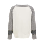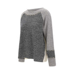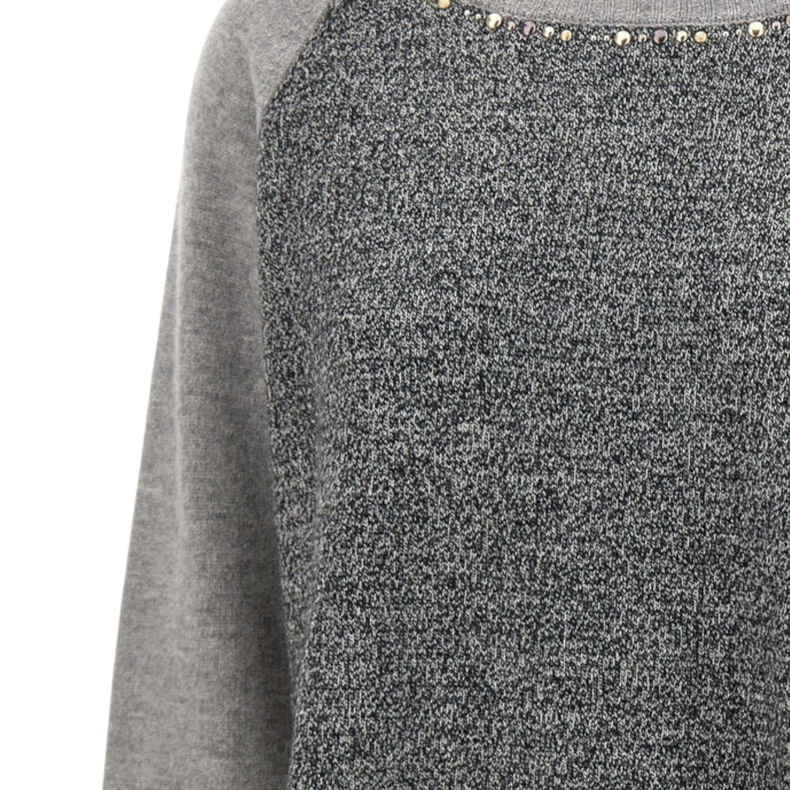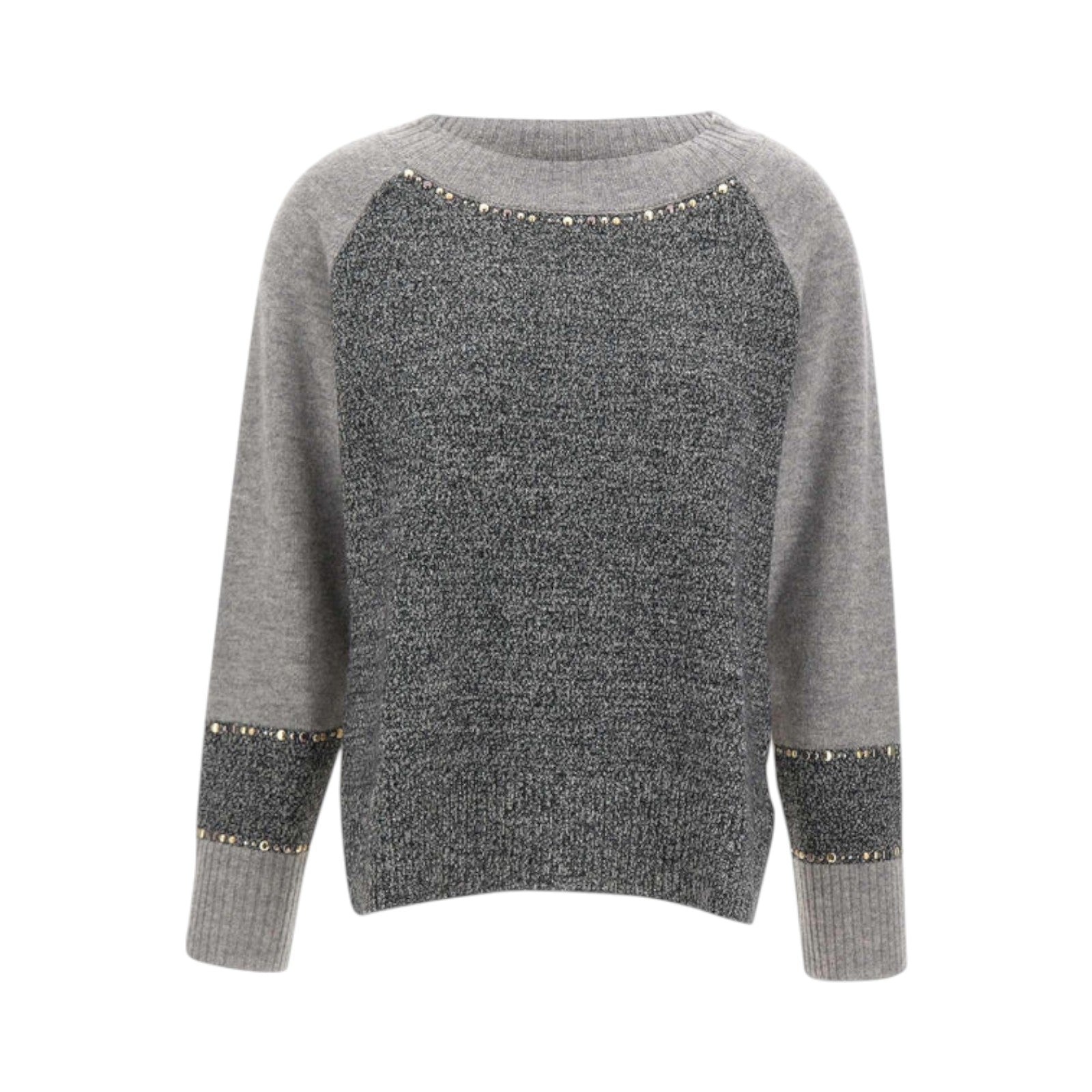 Maglia donna Elena Mirò in lana color grigio mélange e panna, dal design raffinato e femminile. Presenta scollo a barca, maniche lunghe e bordi a costine che garantiscono una vestibilità confortevole. I decori con borchiette aggiungono un tocco luminoso e sofisticato.