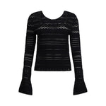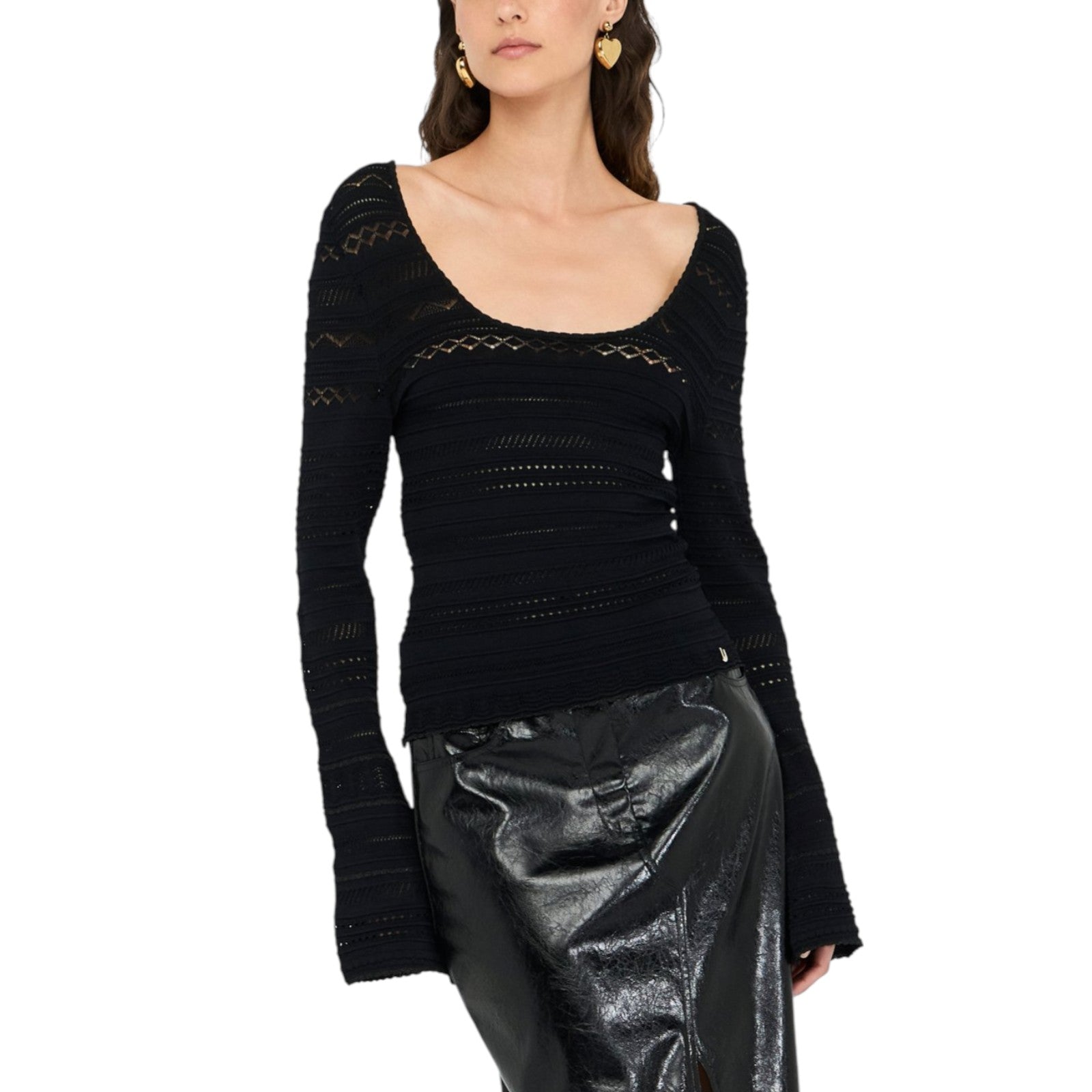 Maglia in misto viscosa. Lavorazione punto pizzo. Scollo rotondo. Maniche lunghe. Polsi a campanella. Logo LJ in metallo con strass al fondo.