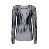 Maglia aderente a maniche lunghe e scollo tondo realizzata in tulle trasparente. Il design è impreziosito da paillettes ricamate a mano e inserti in piume per un look da vera star. Il ricamo di paillettes, di diverse sfumature e disposte in un raffinato effetto dégradé, adorna la superficie creando un gioco di colori e riflessi cangianti.