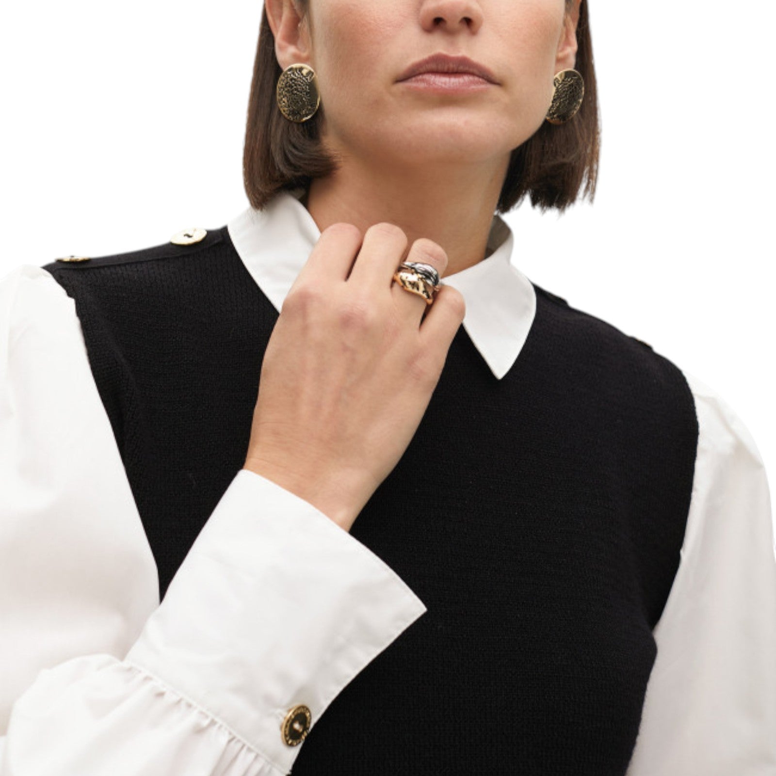 Design elegante di maglione con maniche lunghe e colletto in popeline. Combinazione di colori a contrasto con bottoni dorati decorativi sulle spalle. Perfetto per un look sofisticato.