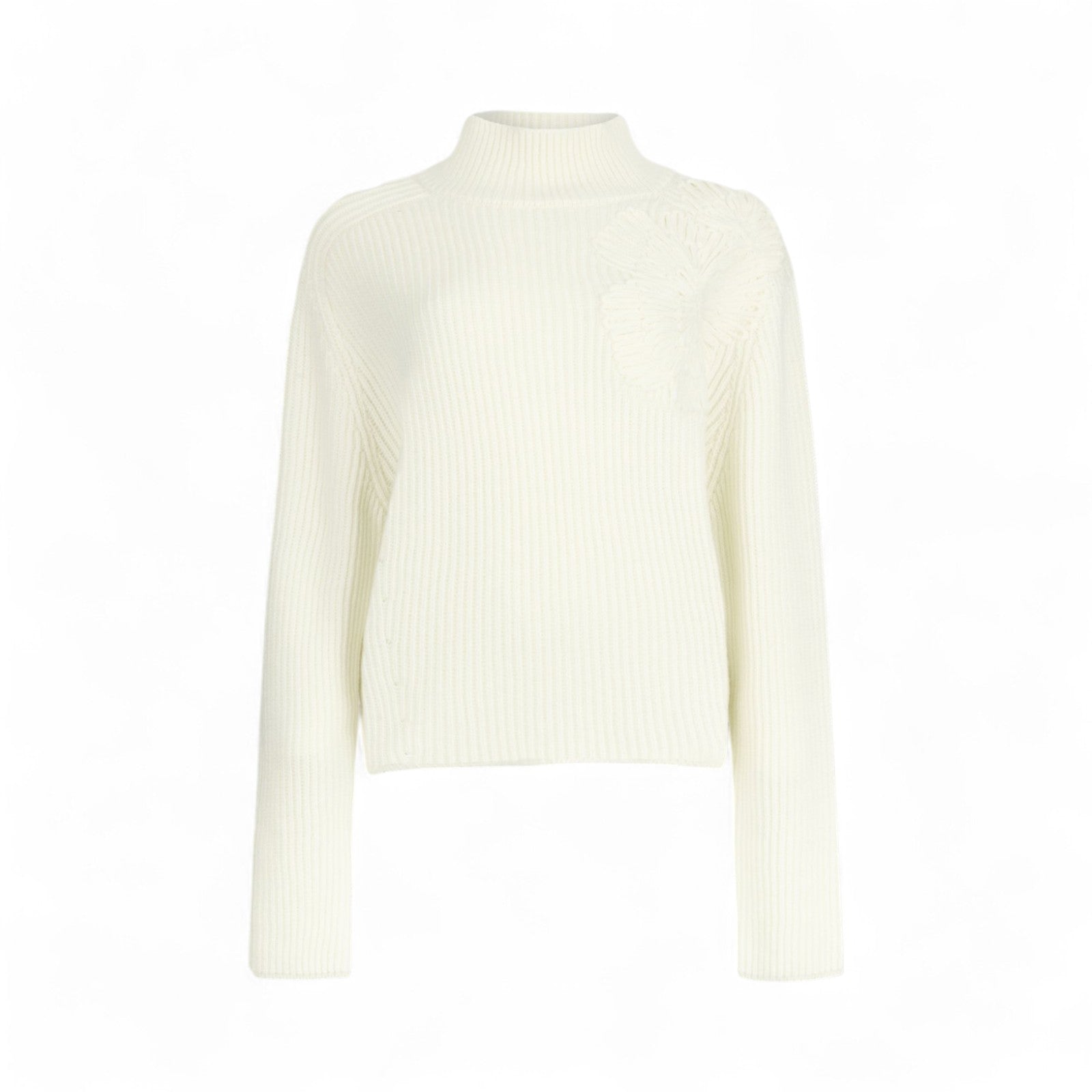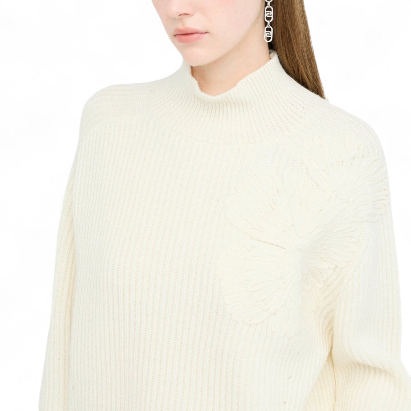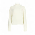 Maglione bianco. Realizzato in misto lana a coste. Collo alto. Maniche lunghe. Logo in metallo sul retro. La modella è alta 178 cm e indossa la taglia S.