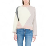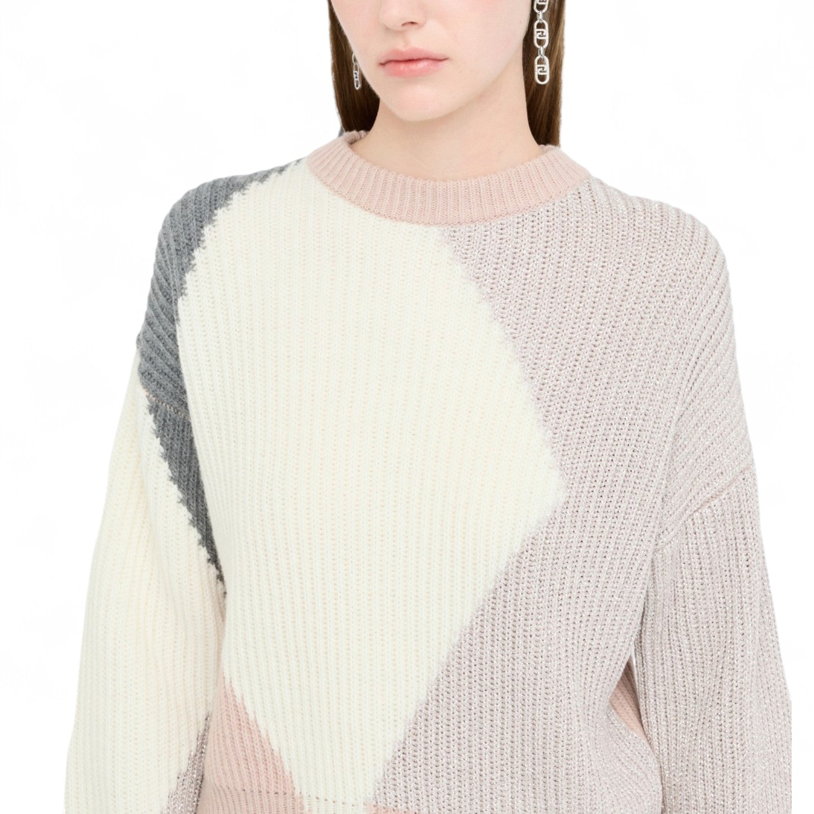 Maglione bianco e grigio. Realizzato in misto lana a coste. Intarsi. Interventi in lurex®. Taglio girocollo. Maniche lunghe a palloncino. Motivo cut-out sul retro. Logo in metallo sul retro. La modella è alta 178 cm e indossa la taglia S.