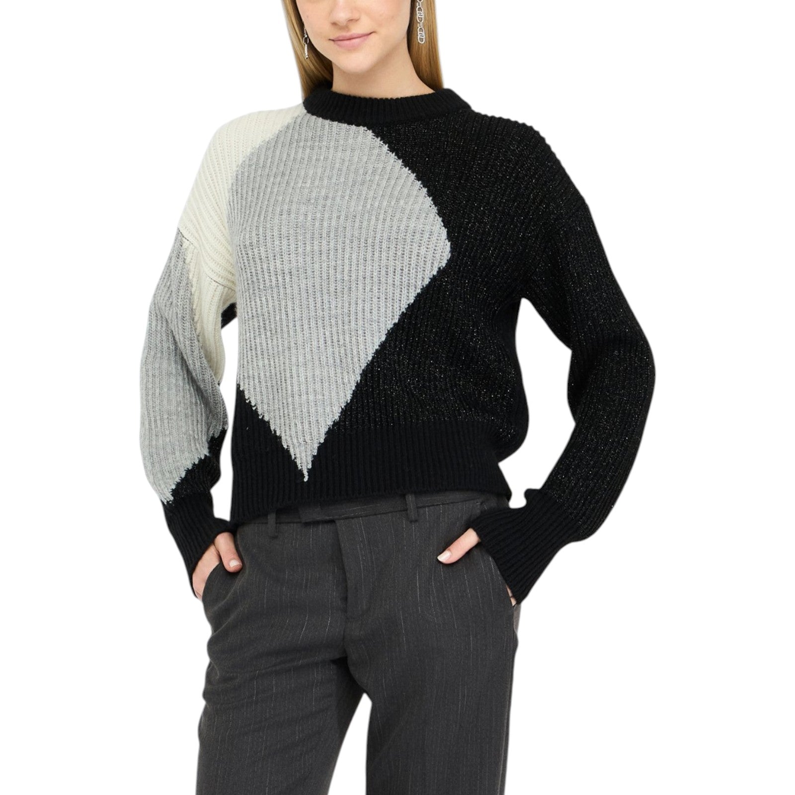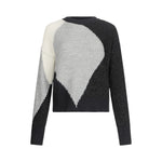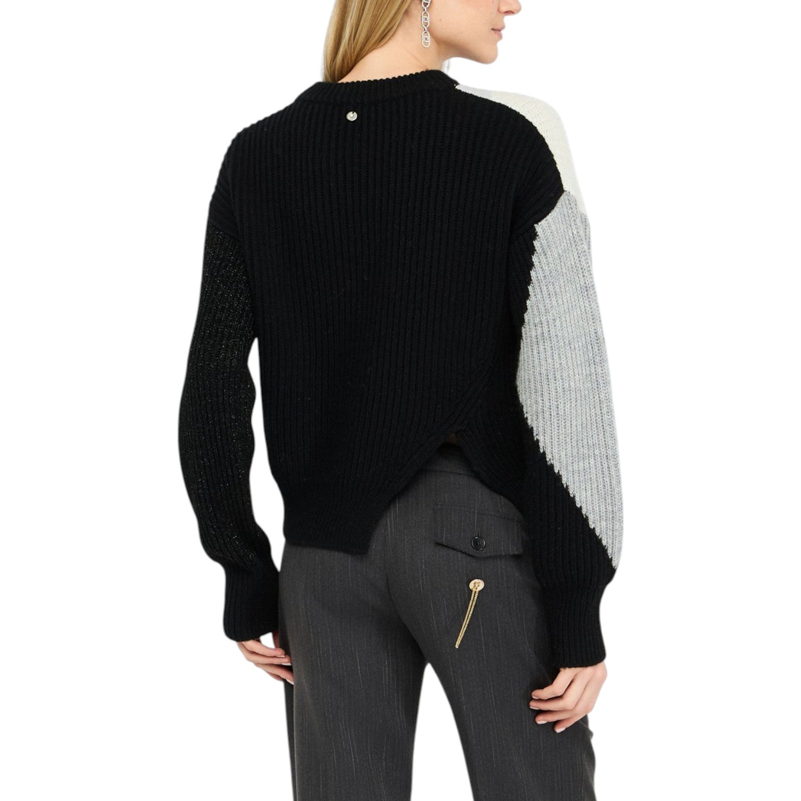 Maglione nero e grigio. Realizzato in misto lana a coste Intarsi. Interventi in lurex®. Taglio girocollo. Maniche lunghe a palloncino. Motivo cut-out sul retro. Logo in metallo sul retro.