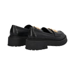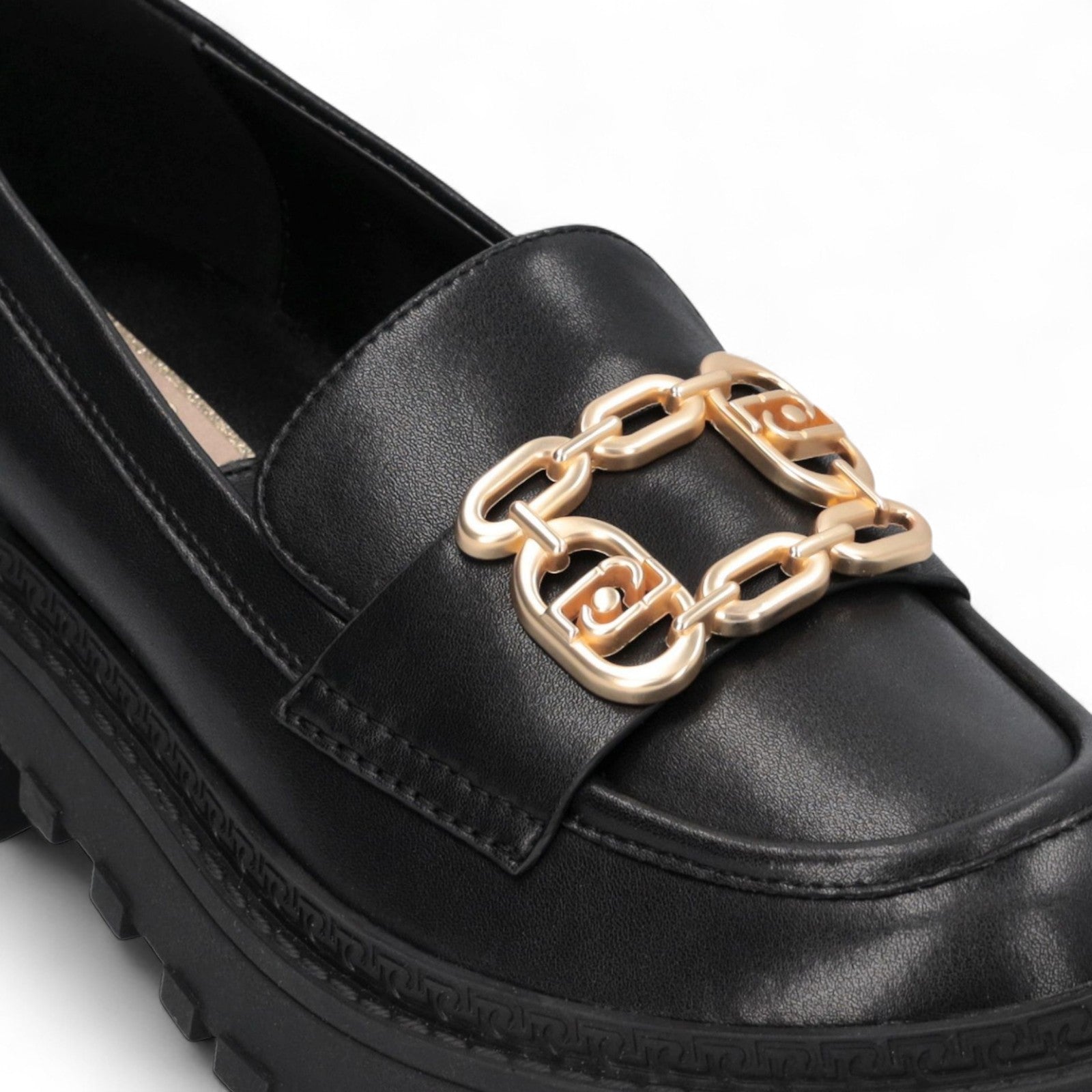 Mocassino donna Liu Jo, colore nero e oro, con tomaia in pelle, interno in tessuto/pelle e suola in gomma, caratterizzato da un tacco di 5 cm.