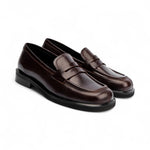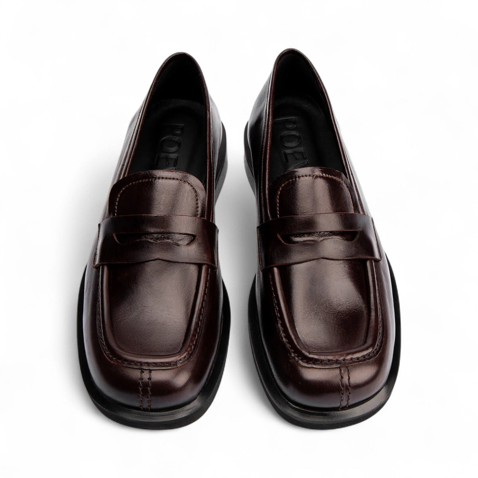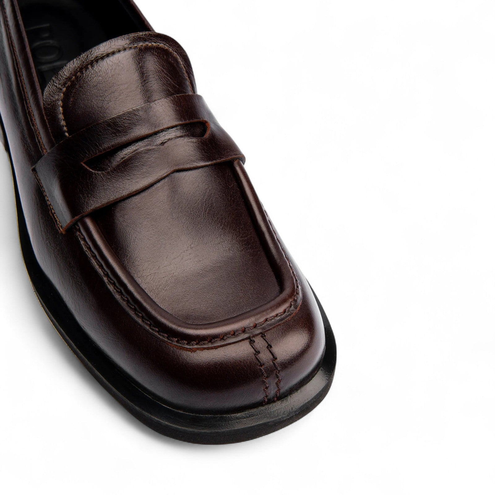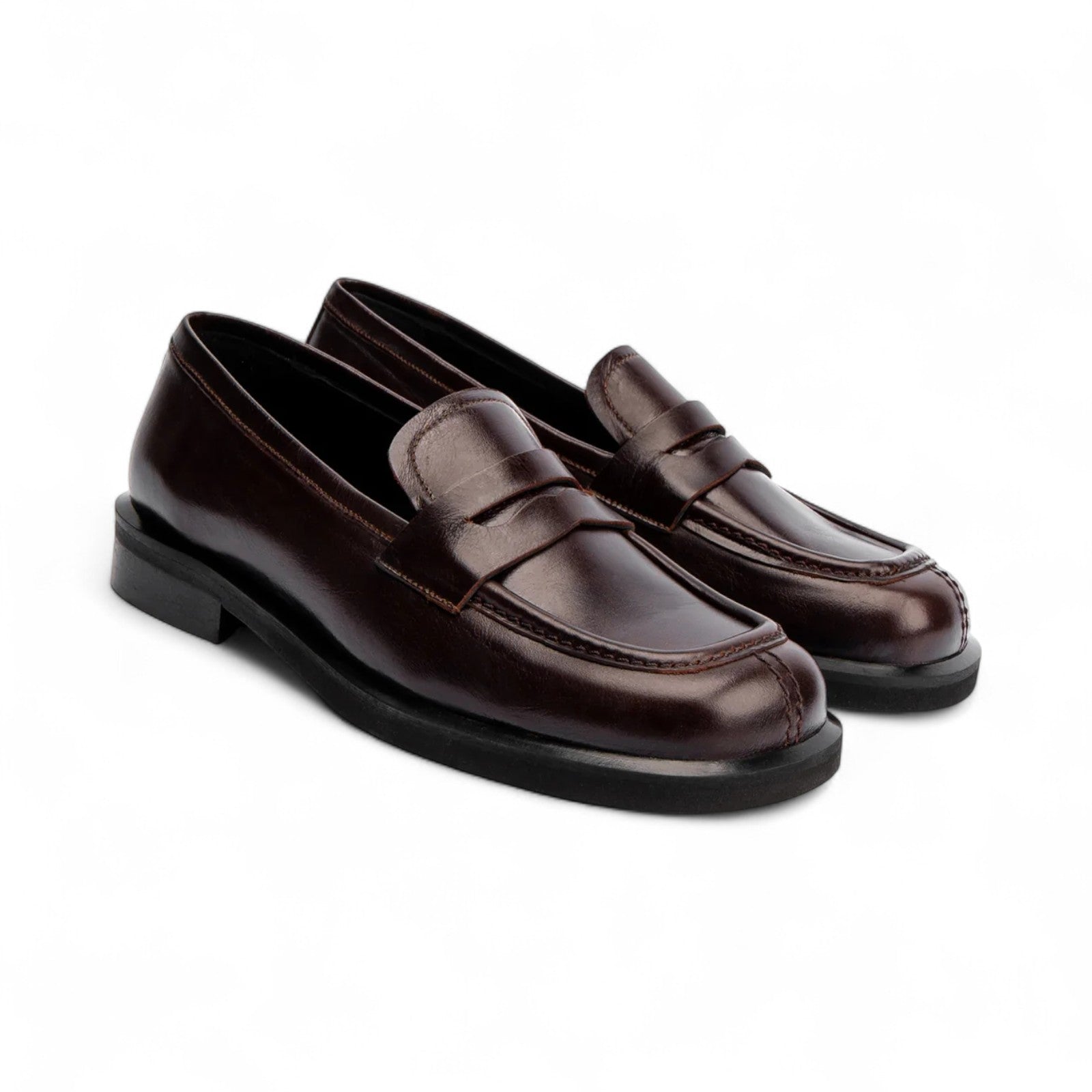 Realizzato a mano in Italia in pelle di vitello marrone scuro sottilmente increspata, Senna è un'interpretazione moderna del classico mocassino penny. La punta morbidamente squadrata è definita da un pannello frontale cucito e da una cucitura centrale, che aggiungono struttura e carattere. Rifinito con una suola in gomma leggera e una morbida fodera in pelle, offre stile e comfort. Tacco: 25mm