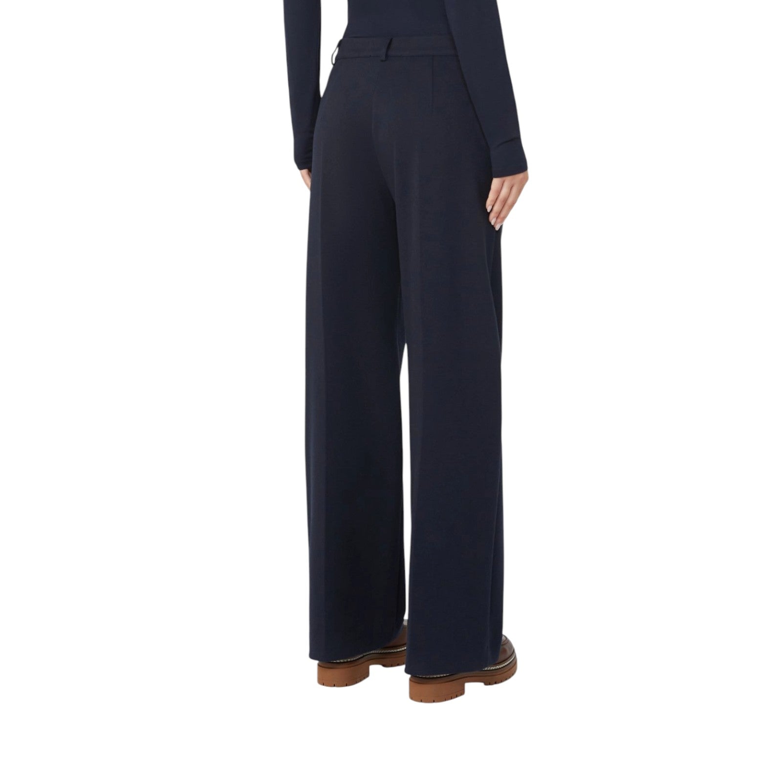 Pantalone in jersey di flanella. Linea dritta. Chiusura con zip coperta e bottone a vista. Tasche alla francese sui fianchi. Pince cucite in vita sul retro. Passanti per cintura e piega stirata.