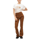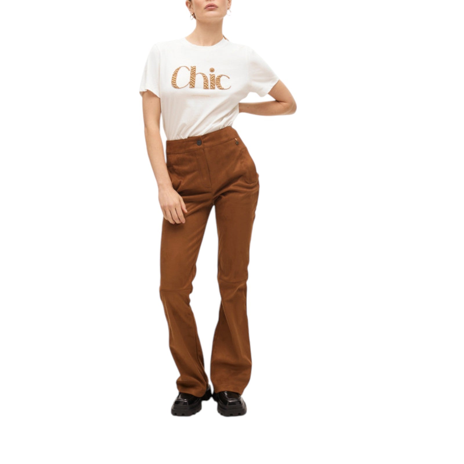 Pantaloni a zampa in morbida antelina marrone, con vita alta e chiusura con bottone e zip. Dettaglio tasca decorativa e logo in metallo.